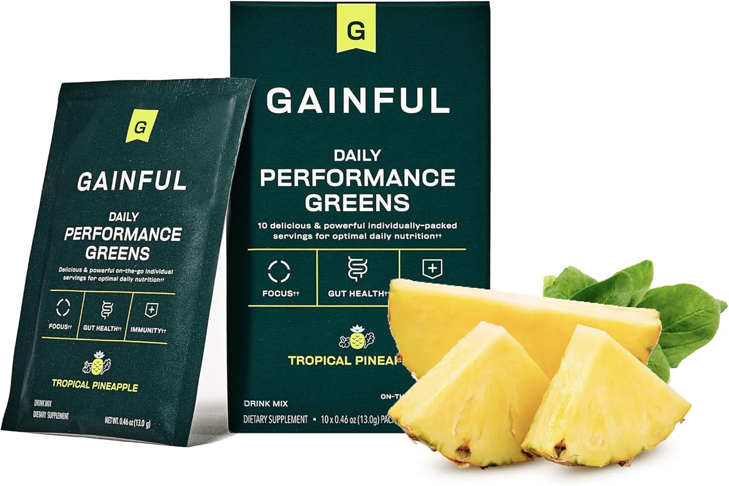 EFFECTIVE AND CLEAN GREENS SUPPLEMENT: Gainful is committed to providing you with clean and effective supplements with no hidden ingredients. This greens superfood powder is made with no artificial flavors, sweeteners, dyes or GMO ingredients. HOW TO USE: With delicious, fresh flavor notes of coconut and pineapple, you'll look forward to drinking our daily greens, everyday. Plus, the convenient travel greens powder packets make it easy to enjoy anywhere you go. To use, pour 1 pack of greens into water. For a lighter flavor, use 10-12oz of water. For a bolder flavor, use 8-9oz of water. Shake, stir, or blend to combine. FOCUS SUPPORT: Our super greens also includes powerful adaptogens that work in conjunction with L Theanine to sharpen focus and reduce tiredness so you can crush your workout or any challenge that lies ahead. IMMUNE SUPPORT: Nurture your overall health and immunity from whole food ingredients included in our greens powder. Chlorella works to provide immune support while 11 organic fruits and vegetables provide sources of phytonutrients (aka goodness from plants for our bodies) for longevity, overall health and wellbeing. DIGESTIVE HEALTH SUPPORT: Gainful's Performance Greens supports overall digestive health. Inulin and Tapioca fiber support your gut surrounding and promote nutrient absorption, while Ginger helps to relax gas and bloating.