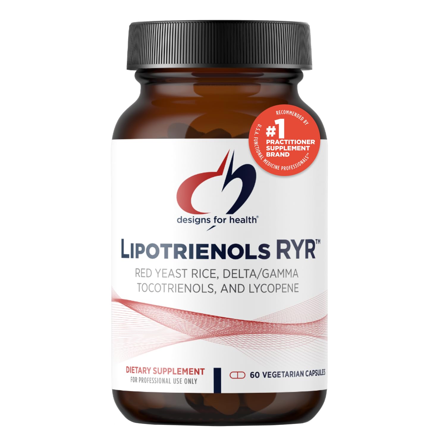 Designs for Health Lipotrienols RYR is a specialized red yeast rice supplement formulated to support cardiovascular and vascular health. Each serving provides organic red yeast rice extract alongside vitamin E isomers in the form of delta- and gamma-tocotrienols, plus lycopene and lecithin. This combination is intended to help maintain blood lipids already within the normal range while offering targeted nutritional support., Red yeast rice (Monascus purpureus) naturally contains compounds known as monacolins, which have been shown to support healthy blood lipid levels when they are already in the normal range. In this formula, red yeast rice is paired with high delta-fraction tocotrienols, a form of vitamin E, and lycopene, with lecithin included to support bioavailability. The synergy of these ingredients provides a comprehensive approach to cardiac and vascular nutritional support using non-GMO, gluten-free, and dairy-free components in a vegan-friendly capsule., Lipotrienols RYR is well-suited for adults who want focused nutritional support for cardiovascular wellness and the maintenance of lipid levels already within a healthy range. It may be of particular interest for those prioritizing general wellness and heart health as part of a balanced lifestyle. As with any supplement targeting cardiovascular support, individuals using medications or managing health conditions should consult their healthcare provider before use.