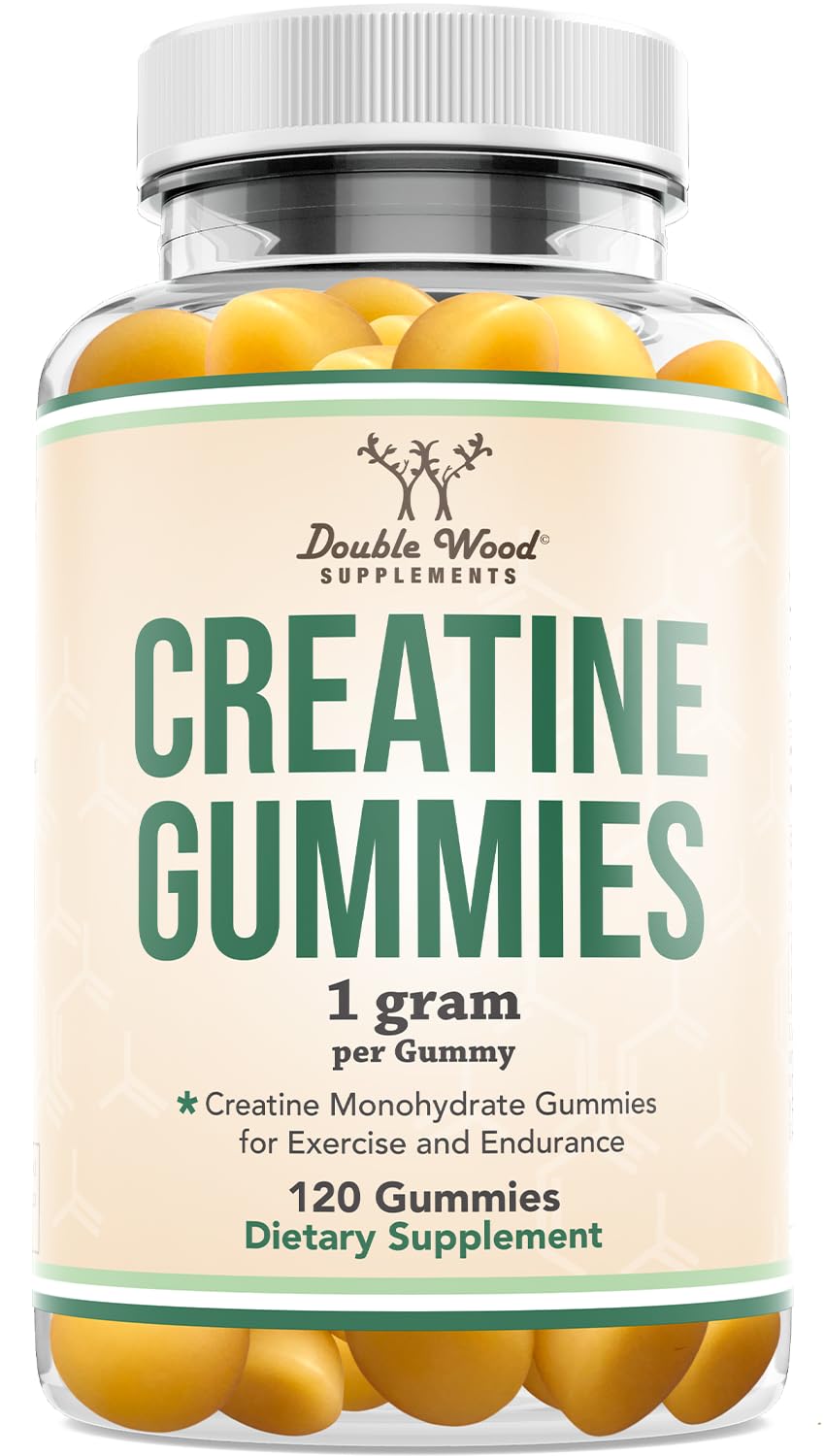 Creatine Monohydrate Gummies by Double Wood offer creatine in an easy-to-take gummy form, providing 1g of creatine monohydrate per serving. Each bottle contains 120 gummies, giving a convenient way to add creatine to your daily routine without powders or capsules. The formula is described as containing no fillers and is suitable for those seeking a gummy-based creatine option., Creatine monohydrate is widely used as a sports nutrition ingredient to support training performance and overall fitness goals. Delivering creatine in a gummy format can be more convenient for people who prefer not to mix powders or swallow tablets. According to the product description, these gummies are vegan safe, non-GMO, and gluten free, which may appeal to individuals with specific dietary preferences. The absence of listed fillers is highlighted as a key feature for ingredient-conscious users., This product is intended for adults looking to include creatine monohydrate as part of their fitness or general wellness regimen in a chewable format. It may be of particular interest to those in strength training, running, or other active lifestyles who prefer gummies over traditional creatine powder. Individuals who are pregnant, nursing, under medical supervision, or using medications should consult a healthcare professional before use.