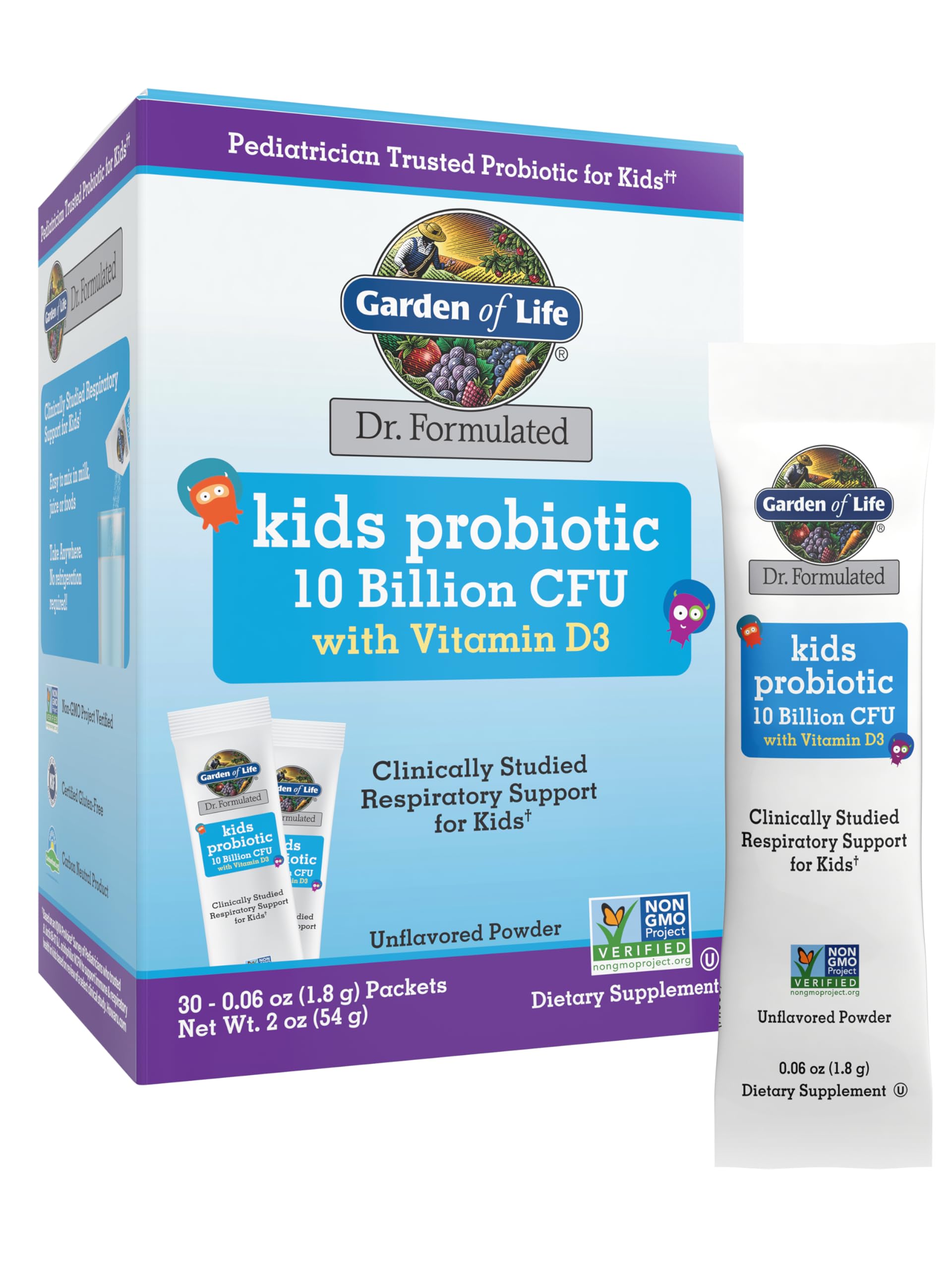 Dr. Formulated Kids' Probiotic with D3 is an unflavored powder stick designed for toddlers and older children. Each stick pack provides 10 Billion CFU of clinically studied probiotics alongside vitamin D3. This convenient formula supports immune function while contributing to healthy bones and teeth in growing kids., Probiotics are beneficial bacteria that help maintain a balanced gut environment, which plays an important role in overall wellness and immune support. This kids' probiotic delivers 10 Billion CFU of strains that have been clinically studied for respiratory and immune support in children. Vitamin D3 is included to support normal bone mineralization and tooth development, while also contributing to healthy immune system function. The powder is unflavored and mixes easily into your child's favorite food or beverage, making daily use simple., This product is ideal for parents looking to support their child's immune function and bone health with a simple, mix-in probiotic and vitamin D3 supplement. It suits busy families who prefer an unflavored powder that doesn't change the taste of foods or drinks. As with any supplement for children, caregivers should consult a healthcare professional before use, especially if the child has a medical condition or is taking medication.