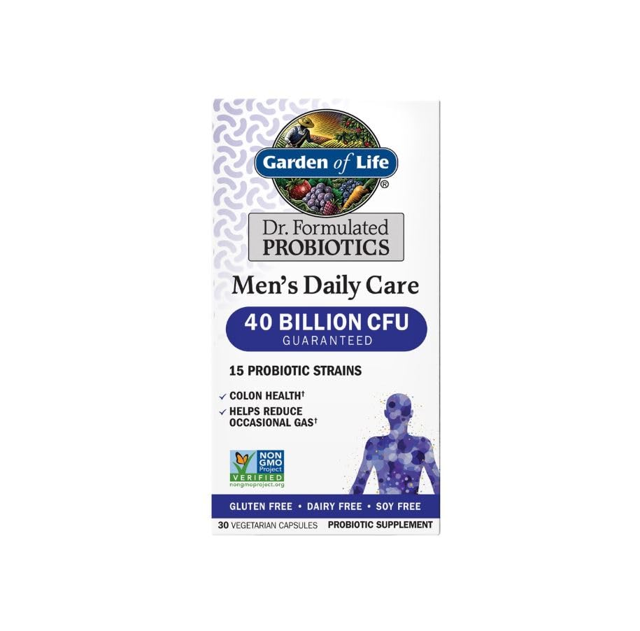 Garden of Life Dr. Formulated Probiotics Men's Daily Care is a targeted daily probiotic designed specifically for men's digestive support. Each vegetarian capsule delivers 40 billion CFU from 15 diverse probiotic strains, along with a Men's Daily Probiotic Blend. The formula is complemented by an organic prebiotic fiber blend to help nourish beneficial bacteria and support overall digestive comfort., This men's probiotic combines 35 billion Lacto cultures and 15 billion Bifido cultures to help maintain a healthy balance of gut flora. The included Men's Daily Probiotic Blend (218 mg) is formulated to address typical male digestive needs, while 365 mg of organic prebiotic fiber blend provides fuel for the live cultures. Together, the probiotics and prebiotics work synergistically to help maintain colon health and reduce occasional gas, supporting a more comfortable digestive experience., Men's Daily Care is well-suited for adult men seeking everyday support for gut and colon health, whether for general wellness or to complement an active lifestyle. It is a good option for those looking to avoid common allergens, as it is formulated without dairy, soy, peanuts, tree nuts, or shellfish ingredients. As with any supplement, men with medical conditions or taking medications should consult a healthcare professional before use.