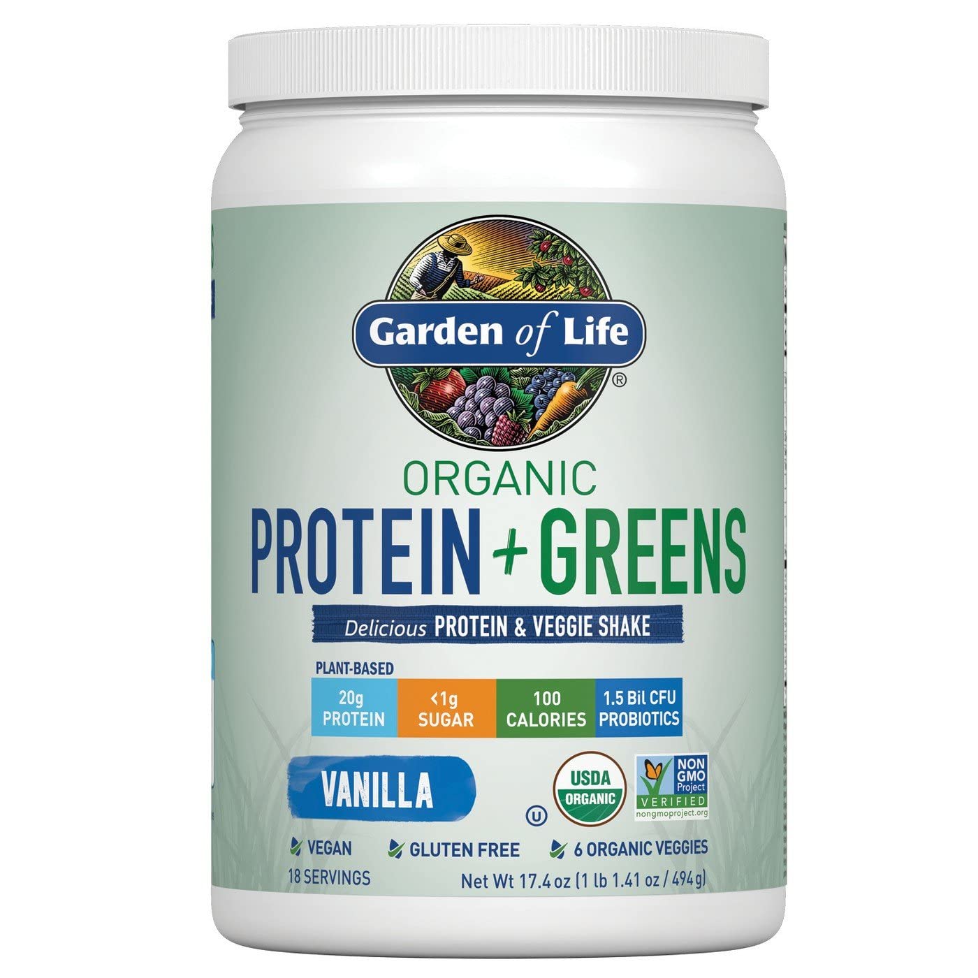 Garden of Life Organic Protein + Greens Vanilla is a plant-based protein powder that combines organic protein sources with nutrient-rich organic greens and vegetables. Each serving delivers 20 grams of smooth, easily digested plant protein along with organic spinach, kale, alfalfa grass juice and other veggies. With 100 calories and less than 1 gram of sugar per serving, it offers a convenient option for supporting daily protein intake., This formula features a blend of organic sprouted brown rice, organic peas, organic chia, and organic beans, providing a complete protein profile from multiple plant sources. It also includes organic greens such as alfalfa grass juice, spinach, kale, and broccoli, plus carrots and beets for additional phytonutrients. With 1.5 billion CFU probiotics, non-GMO enzymes, and 3 grams of organic fiber, it is designed to support digestion while delivering protein and greens in one scoop. The powder is USDA Organic, Non-GMO Project Verified, gluten free, plant-based, and made without artificial colors or added sugars., This product is suitable for those following vegan or plant-based lifestyles, as well as individuals looking for a clean protein option with added greens for general wellness or fitness routines. It can be added to smoothies or used as a pre- or post-workout protein source. As with any supplement, those who are pregnant, nursing, taking medication, or have a medical condition should consult a healthcare professional before use.