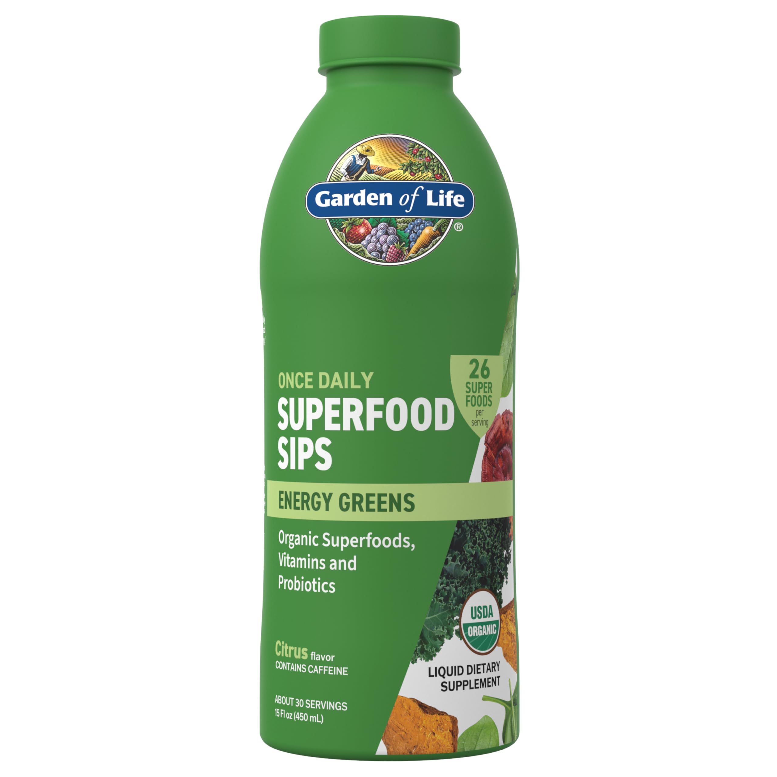 Garden of Life Superfoods Sips Citrus is a once-daily liquid superfood supplement combining 26 organic superfoods, functional mushrooms, vitamins, minerals, and probiotics. This citrus-flavored formula is designed for those seeking a concentrated way to support vitality, immunity, and energy as part of their daily routine. The convenient liquid format makes it easy to add broad-spectrum nutrition to your day without the need for powders., This superfood blend includes ingredients such as spirulina, blue\u2011green algae, alfalfa, and functional mushrooms like reishi and chaga, offering diverse phytonutrients in each serving. It is infused with 18 vitamins and minerals plus green coffee bean extract to provide energy support while contributing to immune and overall health. Gut-friendly probiotics are included to support digestive health, nutrient absorption, and regularity. Certified USDA Organic and preservative-free, it aligns with clean-label preferences by being vegan, gluten-free, dairy-free, and free from artificial flavors or colors., Superfoods Sips Citrus is ideal for adults focused on general wellness, looking to conveniently support energy, immunity, and digestion with one daily liquid serving. It suits health-conscious individuals who prefer organic, plant-forward, and on-the-go nutrition that can be sipped straight or mixed into smoothies, teas, or juices. Those with specific medical conditions or using prescription medications should consult a healthcare professional before use.