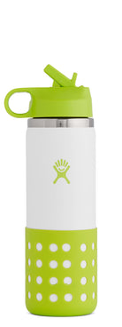 Hydro Flask Kids 20oz Wide Mouth with Straw Lid and Boot in Jungle is a BPA-free, pro-grade stainless steel bottle made for everyday use. Its TempShield double-wall vacuum insulation helps keep cold beverages cold for hours while preventing condensation on the outside. The 20oz capacity and wide mouth opening are designed to suit children's daily hydration at school, activities, or outings., The TempShield insulation minimizes temperature transfer to the outer surface, so the bottle stays comfortable to hold and helps maintain optimal drinking temperature. Made from pro-grade stainless steel, it resists flavor transfer, so drinks taste fresh with each refill. The colorful Wide Mouth Straw Lid is easy to sip from and simple to clean, while the proprietary powder coat provides a durable, sweat-free grip and a finish that stands up to regular use. A matching boot adds extra protection to the base and helps keep the bottle stable on surfaces., This bottle is ideal for children who need a sturdy, reusable water bottle for school, sports, or hobbies. It fits most backpacks and standard cup holders for easy transport. The bottle is dishwasher safe, while the lid is hand washable. The Wide Mouth Straw Lid is not leakproof and is not intended for use with hot liquids, so it should be used only with cold drinks.