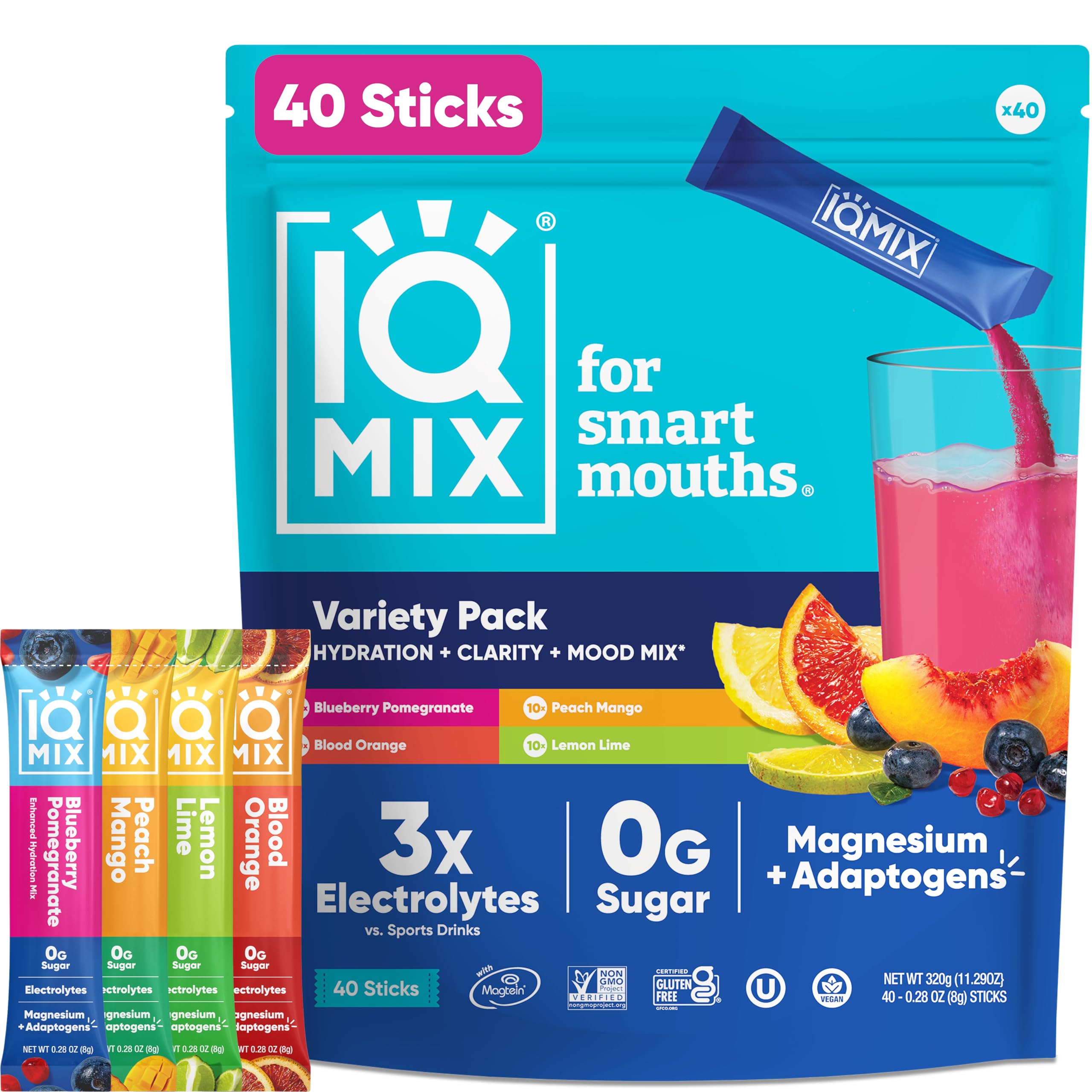 Stay refreshed and energized with the IQMIX Hydration Drink Mix Variety Pack. This convenient 8-stick sampler includes four delicious fruit-inspired flavors—Lemon Lime, Blood Orange, Blueberry Pomegranate, and Peach Mango—designed to support hydration and daily wellness. Each mix combines a carefully balanced electrolyte blend with premium ingredients such as Magtein® Magnesium L-Threonate and Lion's Mane extract, known for their roles in supporting cognitive performance. With only 10 calories and 1g of carbs per serving, IQMIX is KETO-friendly and fits easily into active, health-conscious lifestyles. Whether you're at the gym, at work, or on the go, this hydration solution helps you feel your best—anytime, anywhere.