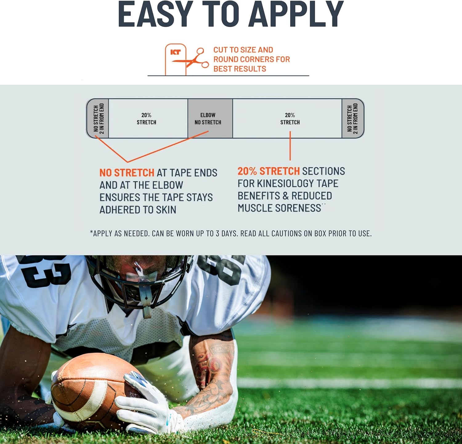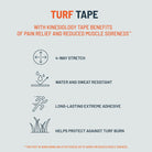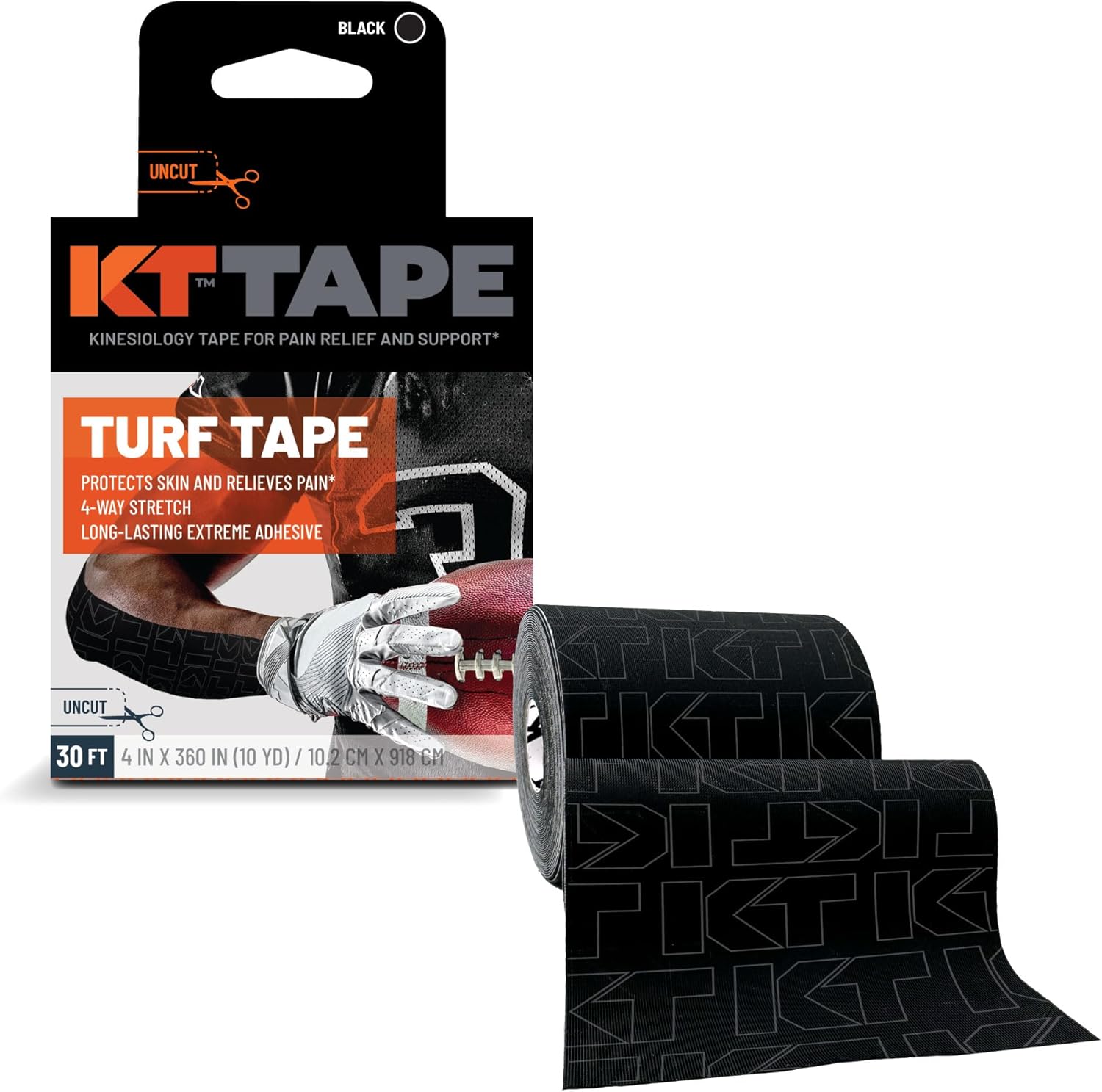 KT Turf Tape is a premium synthetic athletic tape created to help shield your skin from turf abrasions while offering supportive coverage for muscles during sport. The extra-wide 4-inch design and 30-foot roll length make it suitable for covering larger areas such as thighs, arms, or legs. It is intended for athletes who play on artificial turf and want added skin protection and support., This turf tape uses a flexible synthetic material combined with a long-lasting adhesive so it can move with your body during intense activity. The wide format helps reduce the need for multiple overlapping strips, providing more uniform coverage and a smoother feel under uniforms or gear. Designed for use on clean, dry skin, it adheres securely while allowing natural movement on the field or in training., KT Turf Tape is ideal for football players and other field-sport athletes who regularly compete on artificial turf and want extra protection from friction and contact. It can be used in practices, games, and training sessions where repeated sliding or impact is expected. As with any adhesive product used on skin, discontinue use if irritation occurs and consult a healthcare professional if you have sensitive skin or existing skin conditions.