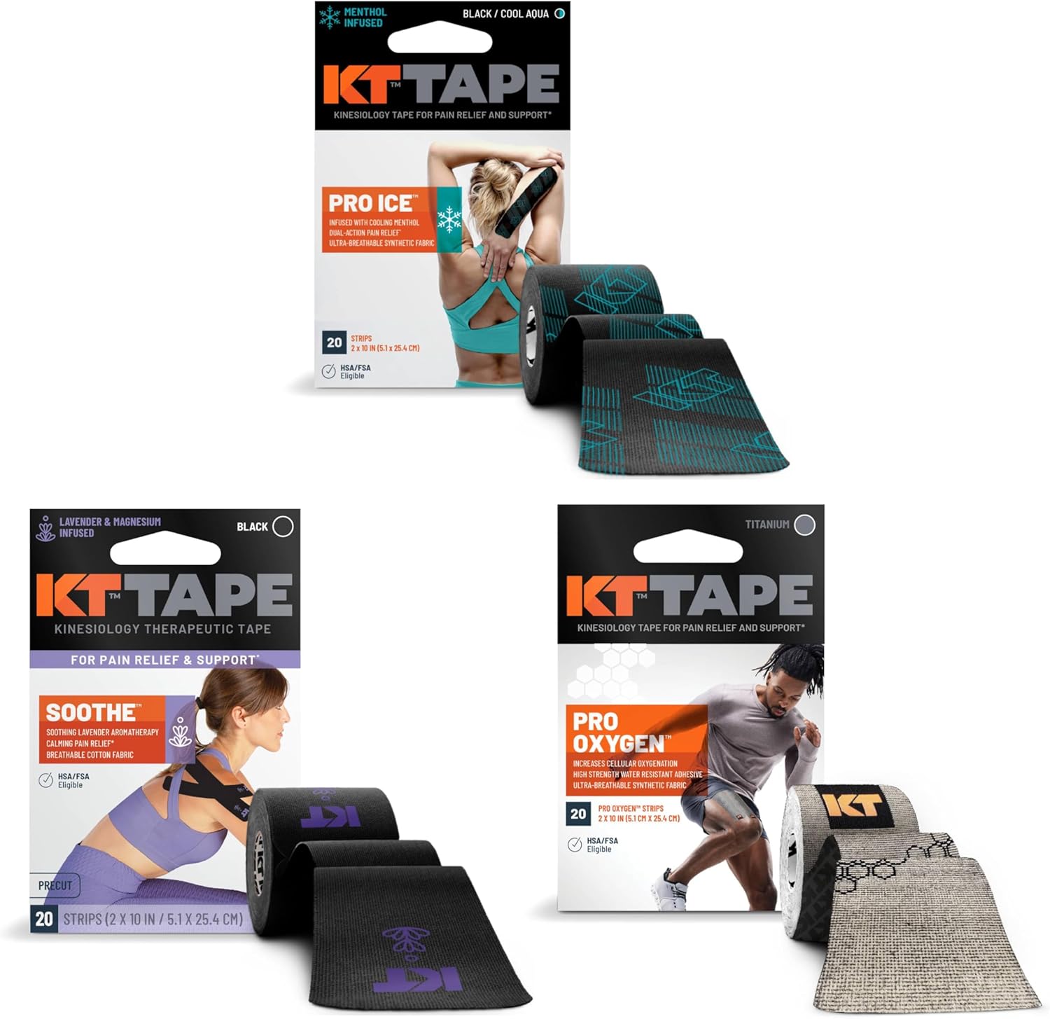 KT Tape Infused Bundle is a collection of performance kinesiology tapes featuring Pro Ice, Pro Oxygen, and Soothe strips. Each 10-inch pre-cut strip is designed for easy application on common muscle and joint areas. This mixed bundle offers a convenient way to access several KT Tape infused variants in one pack., Kinesiology tape is engineered to provide supportive tension along muscles and joints while allowing a full range of motion. The pre-cut 10\ strips help simplify placement, so you can focus on training, recovery, or daily activities. KT Tape's infused formats are created to offer specialized tape options within the same familiar, flexible backing material. The adhesive is intended to stay in place during movement and typical athletic use when applied correctly to clean, dry skin., This bundle is suited for active individuals who regularly use kinesiology tape as part of their training, sports, or general wellness routines. It is ideal for runners, team sport athletes, and fitness enthusiasts looking for an assortment of KT Tape infused styles in a single purchase. Always follow package directions and remove tape if irritation occurs; consult a healthcare professional if you have sensitive skin or underlying conditions.
