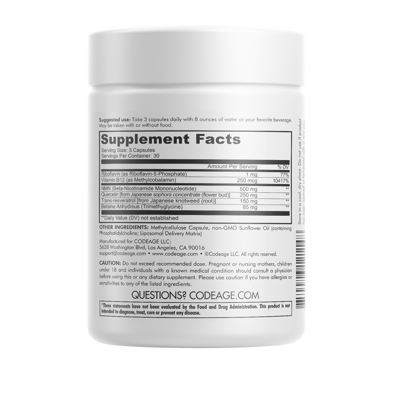 Support your wellness goals with Codeage Liposomal NMN Supplement, a premium vegan formula designed to help maintain energy and cellular health. Each serving delivers nicotinamide mononucleotide (NMN), a known NAD+ precursor, alongside trans-resveratrol, betaine anhydrous (TMG), riboflavin, vitamin B12, and quercetin derived from Japanese sophora flower. This advanced formula uses a non-GMO sunflower-based liposomal delivery matrix to help enhance nutrient absorption. Crafted without gluten, dairy, or soy, and free from artificial ingredients, this supplement is formulated for both women and men seeking high-quality daily support. Manufactured in the USA in a cGMP-certified facility and third-party tested for quality assurance.