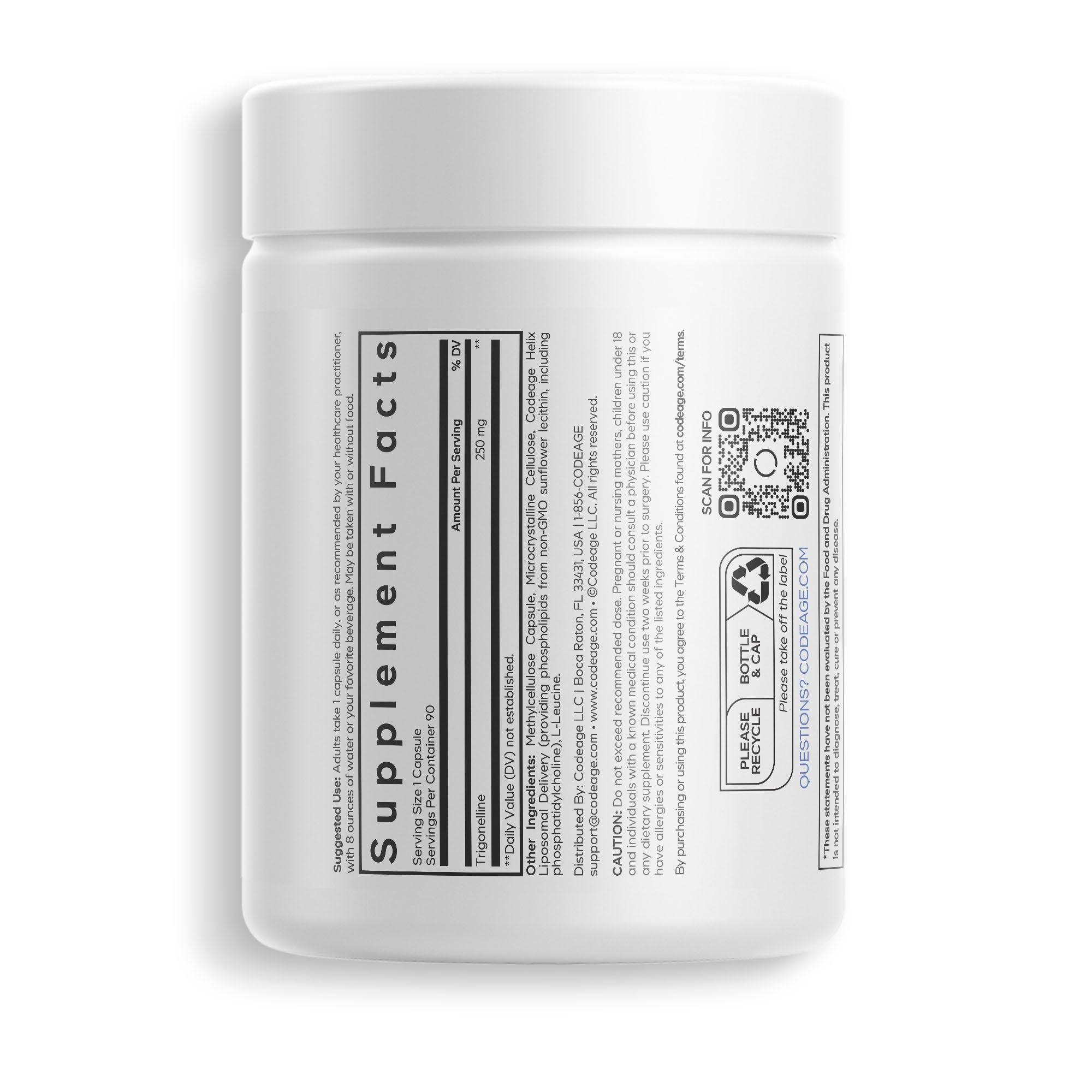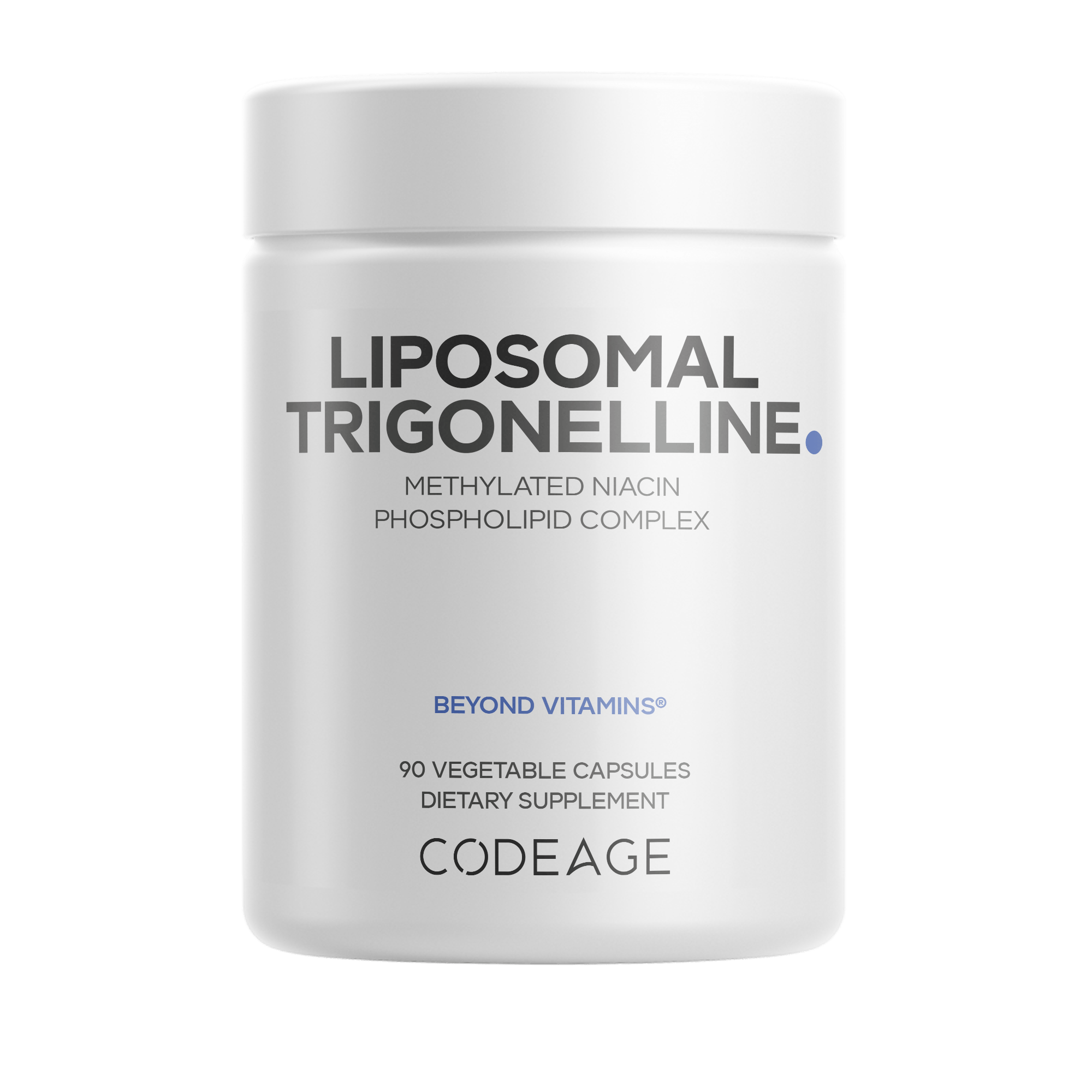 Codeage Liposomal Trigonelline is a premium dietary supplement offering 250 mg of trigonelline per capsule, formulated with advanced liposomal delivery technology for enhanced nutrient bioavailability. This plant-based alkaloid is delivered using Codeage's proprietary Helix liposomal system, which includes phospholipids from non-GMO sunflower lecithin and phosphatidylcholine to support absorption.