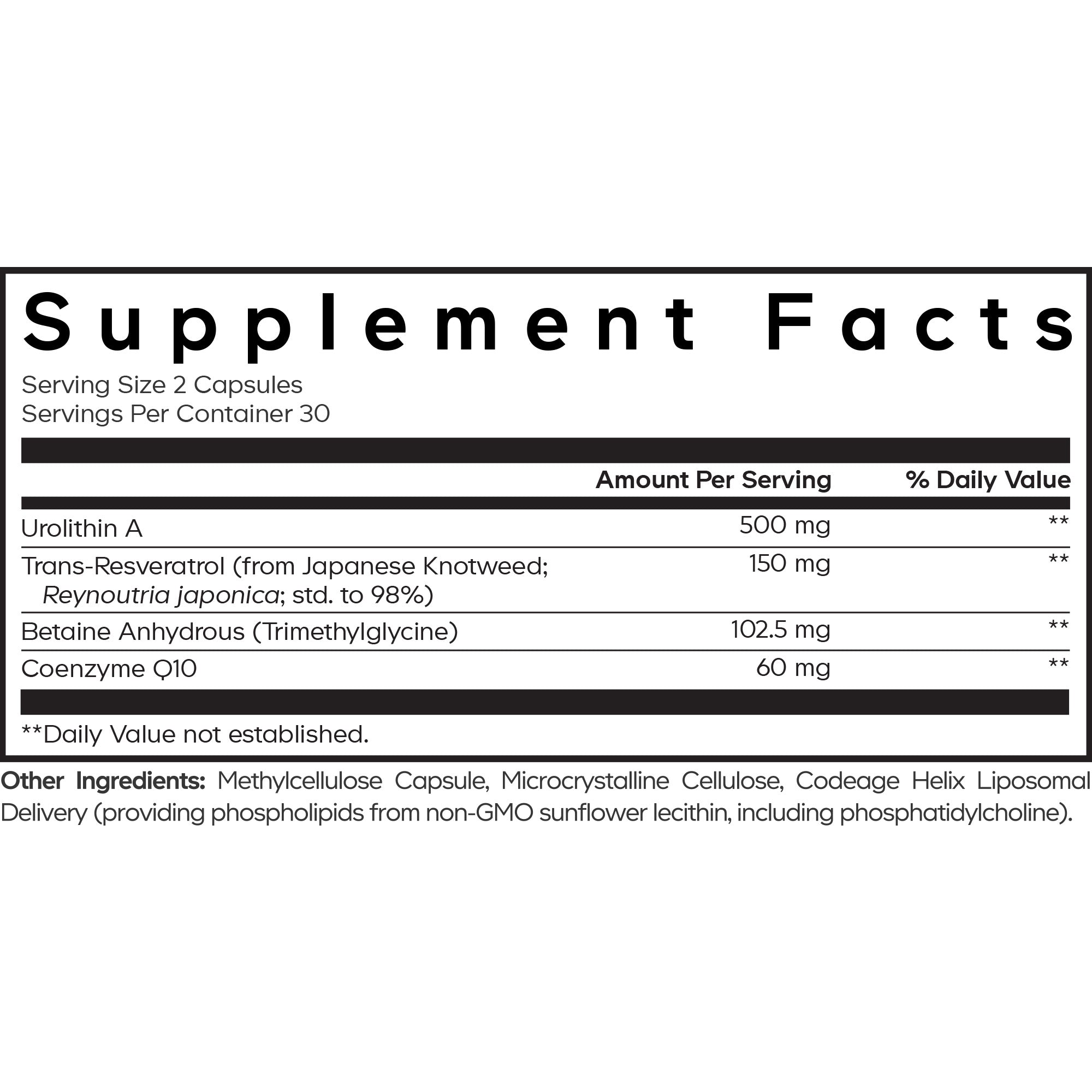 Each serving delivers 500 mg of Urolithin A, along with trans-resveratrol derived from Japanese Knotweed, betaine for cellular support, and CoQ10, a key component in cellular energy production. This thoughtful formulation is ideal for those pursuing their fitness and wellness goals.