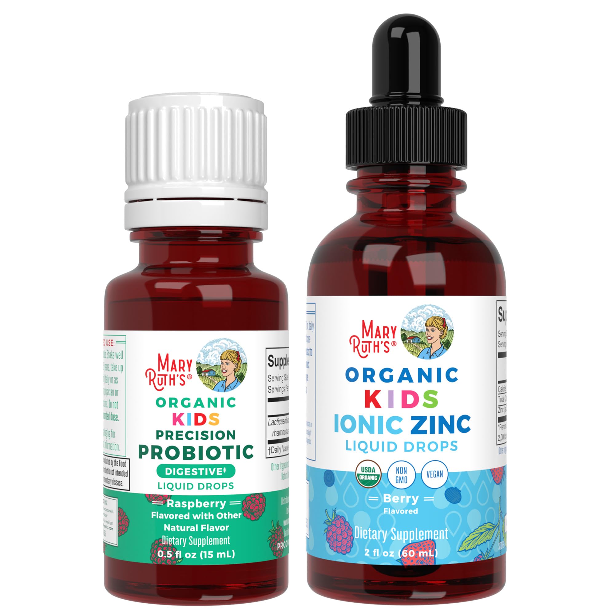 MaryRuth Organics Precision Probiotic & Zinc Drops (Berry) for Kids combine a tailored probiotic blend with zinc in an easy-to-take liquid. Formulated specifically for children, this product is designed to support gut health, immune function, and overall wellness. The berry flavor makes daily intake more enjoyable for kids who prefer liquids over capsules or tablets., This precision formula features clinically studied probiotic strains to help maintain a healthy balance of gut bacteria, which plays an important role in digestion and immune function. Zinc is included as an essential mineral that contributes to normal immune system function and overall growth and development. The liquid format allows flexible dosing, making it easier for parents to adjust serving sizes according to age and healthcare provider guidance. USDA Organic and Clean Label Project Verified certifications reflect strict quality standards for ingredients and purity., These drops are ideal for parents looking to support their child's gut and immune health as part of a daily wellness routine. Suitable for families seeking vegan, non-GMO, and gluten-free options, it can be used for general wellness support throughout the year. As with any supplement for children, caregivers should consult a pediatrician before use, especially if the child has a medical condition or is taking medications.