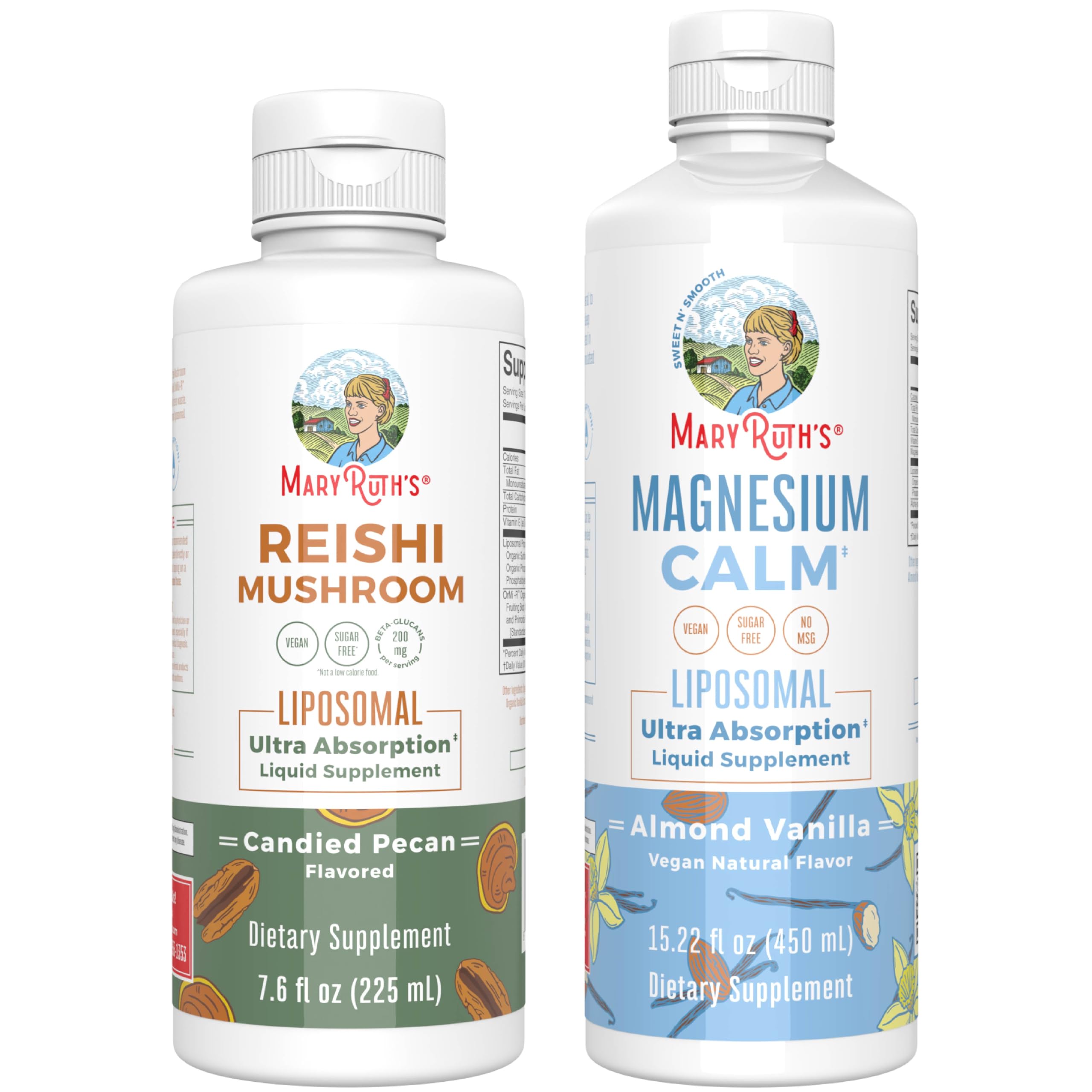 This bundle combines MaryRuth Organics Reishi Liposomal in Candied Pecan flavor with their Magnesium in Almond Vanilla flavor. Reishi is a well-known functional mushroom traditionally used to support immune health and overall wellness, while magnesium is an essential mineral that contributes to relaxation and calm. Together, these liquid formulas offer a convenient way to support daily health routines with enjoyable, dessert-inspired flavors., Reishi Liposomal uses a liposomal delivery format designed to help the reishi extract disperse effectively in liquid form. Magnesium is provided in a flavored liquid formula, allowing those who prefer to avoid capsules or tablets to integrate this mineral into their routine more easily. Both products are Clean Label Project Verified\u00ae, indicating testing for certain contaminants and ingredient quality markers, and they are formulated to be vegan, non-GMO, and gluten-free. This combination focuses on simple, recognizable ingredients and taste profiles that encourage consistent daily use., This bundle is suitable for adults looking to support immune function, calm, and general wellness as part of a balanced lifestyle. It may appeal to those who prefer liquid supplements, including individuals following plant-based or dairy-free routines. As with any supplement, those who are pregnant, nursing, have a medical condition, or use medications should consult a healthcare professional before use.