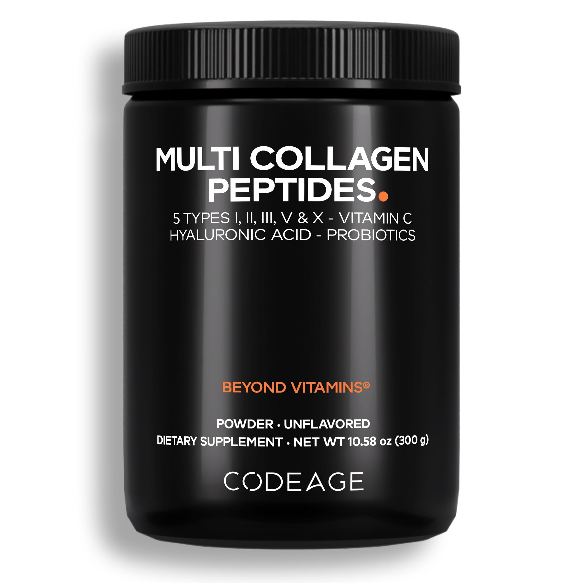 Support your wellness routine with Codeage Multi Collagen Peptides + Probiotics, a premium unflavored powder formulated with five types of collagen, vitamin C, hyaluronic acid, and probiotics. This advanced blend combines collagen from multiple clean sources, including grass-fed bovine, wild-caught fish, organic chicken bone broth, beef bone broth, and eggshell membrane to deliver a diverse amino acid profile.