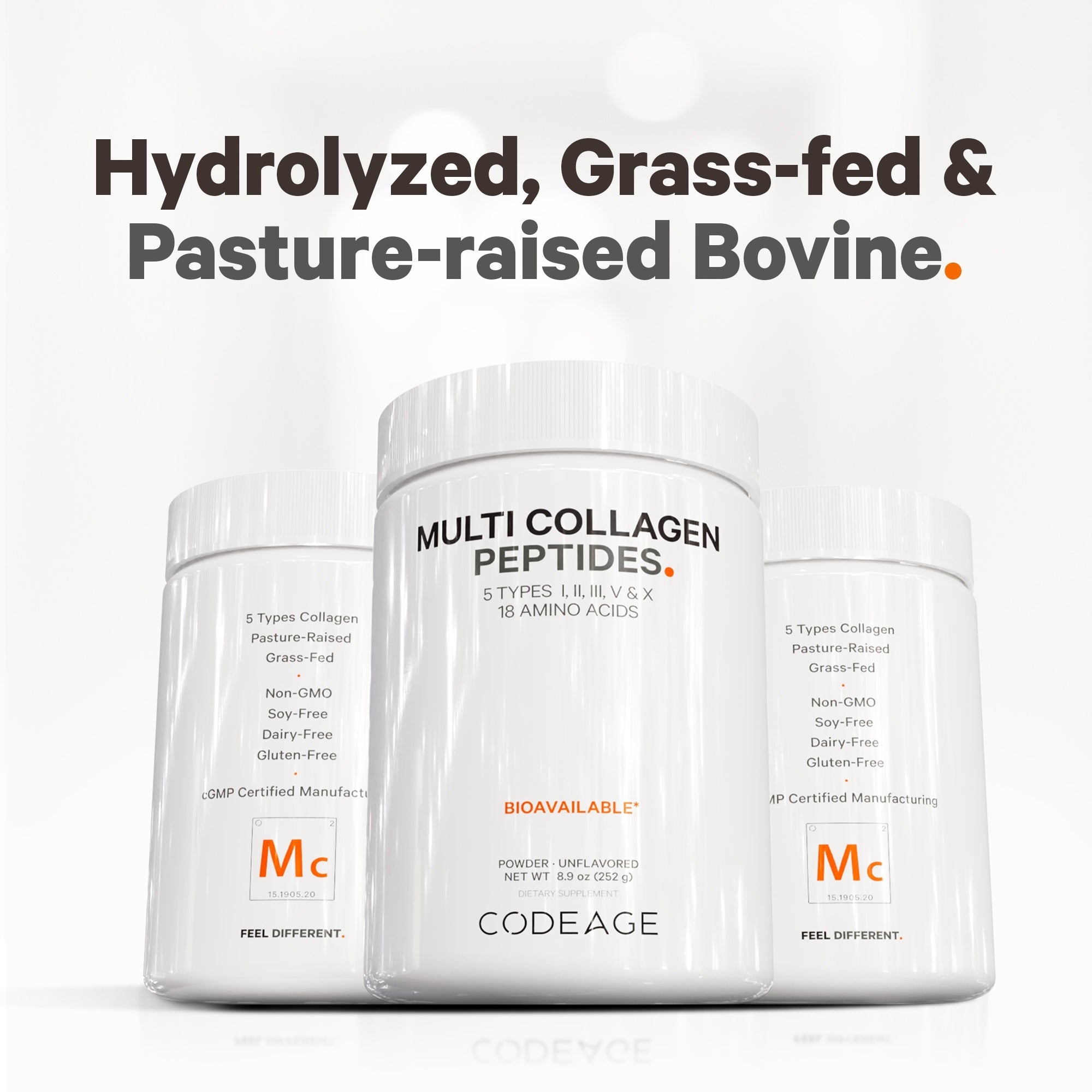 Support your wellness routine with Codeage Multi Collagen Peptides Powder – a high-quality, all-in-one collagen supplement featuring five types of collagen (Type I, II, III, V, and X) sourced from grass-fed bovine, wild-caught fish, organic chicken and beef bone broth, and eggshell membrane. This unflavored powder is easy to mix into smoothies, teas, or recipes, making it a convenient addition to your daily lifestyle. With 18 amino acids and no carbs, it's ideal for those following keto or paleo lifestyles. Free from artificial flavors, dairy, soy, and gluten, it’s manufactured in a cGMP-certified facility and third-party tested for quality and purity.