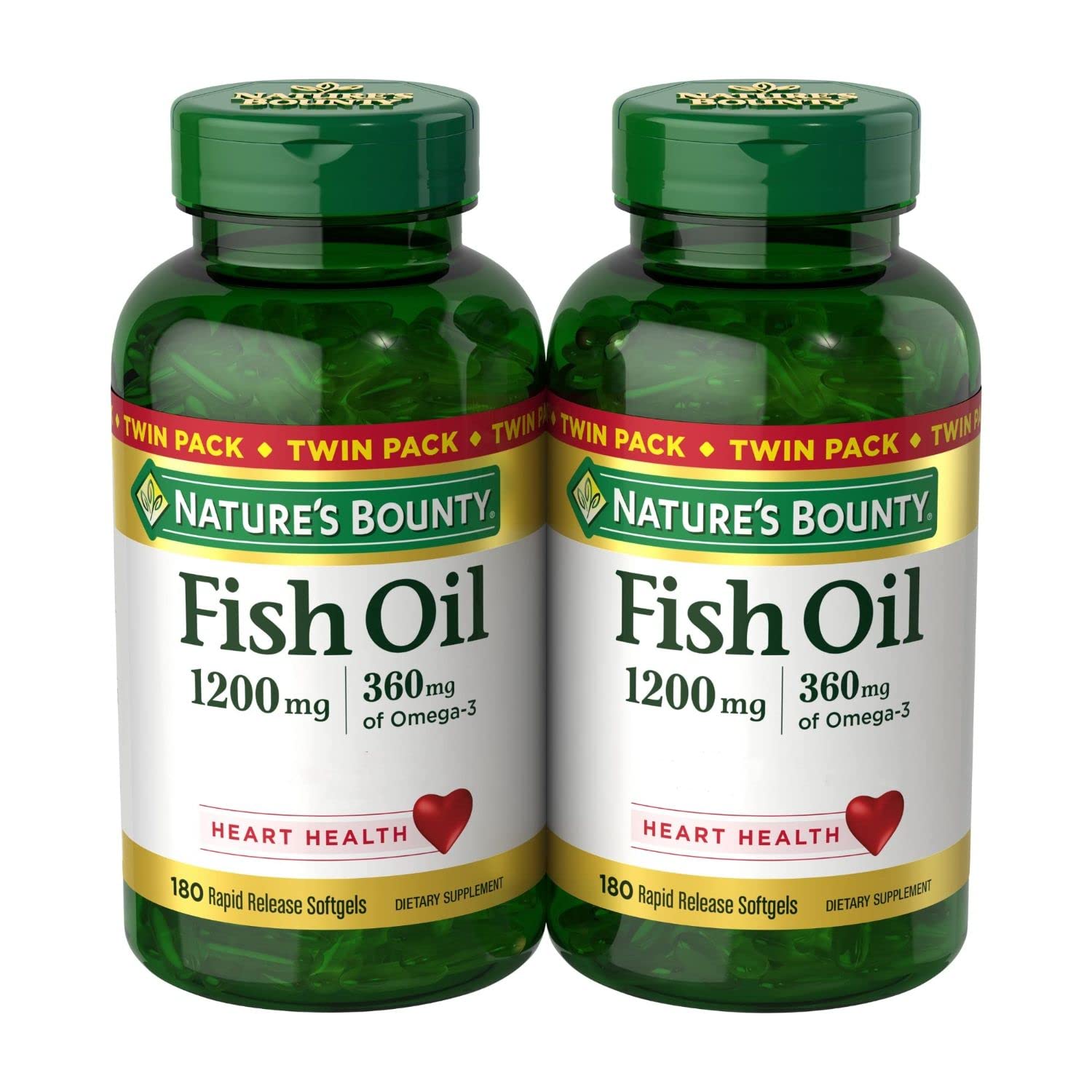 Nature's Bounty Fish Oil 1200mg delivers naturally occurring Omega-3 fatty acids, including EPA and DHA, in rapid release liquid softgels. This fish oil supplement is formulated to help support and maintain the health of your cardiovascular system and heart at the cellular level. Each twin pack provides a total of 360 softgels for ongoing wellness support., Omega-3 fatty acids such as EPA and DHA are considered \good fats\ that play an important role in heart and metabolic health. Each serving supplies 360mg of EPA and DHA combined, helping to support heart cellular and metabolic function and maintain triglyceride levels already within a normal range. The fish oil is purified to eliminate mercury, providing a cleaner source of Omega-3s for those who may not regularly consume seafood. Rapid release softgels are designed for easy swallowing and convenient daily use., This product is ideal for adults looking to support cardiovascular health and overall wellness with a high-quality fish oil supplement. It is especially suitable for those who do not enjoy eating fish but still want a source of EPA and DHA. The formula contains no shellfish, gluten, lactose, sugar, or artificial colors and sweeteners; however, individuals with medical conditions or those taking medications should consult a healthcare professional before use.