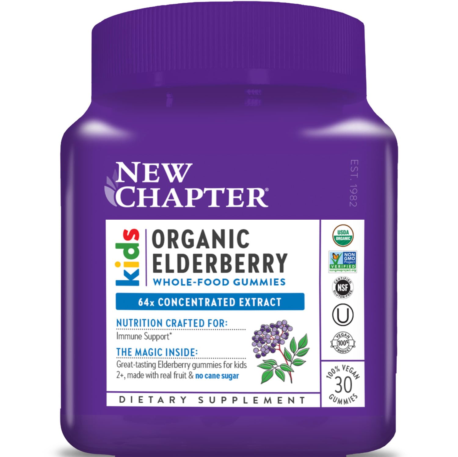 These New Chapter Elderberry Gummies for Kids 2+ provide concentrated Black Elderberry extract in a convenient, great-tasting gummy format. Designed to support kids' natural immune defenses, each gummy is made with real organic fruit and contains standardized ElderCraft elderberry extract. The formula offers an easy way for children to enjoy elderberry as part of their daily wellness routine., The ElderCraft Black Elderberry extract is made from sustainably sourced Haschberg type elderberries (Sambucus nigra L.) grown in Austria and is standardized for a rich profile of beneficial flavonoids. This extract is 64 times more concentrated than pure Black Elderberry, allowing a powerful elderberry experience in a small gummy. The gummies are naturally sweetened with organic fruit instead of cane sugar, corn syrup, or agave/tapioca syrup, and are free from gelatin, harsh solvents, and artificial flavors or colors. USDA Organic and Non-GMO Project Verified status further underline the quality-focused sourcing and manufacturing., These gummies are ideal for parents seeking an organic, plant-based elderberry option for children ages 2 and up to support general immune health throughout the year. They suit families looking for vegan, gluten-free, and kosher-certified supplements made without cane sugar. As with any supplement for children, guardians should consult a healthcare professional if the child has a medical condition or is taking medications.