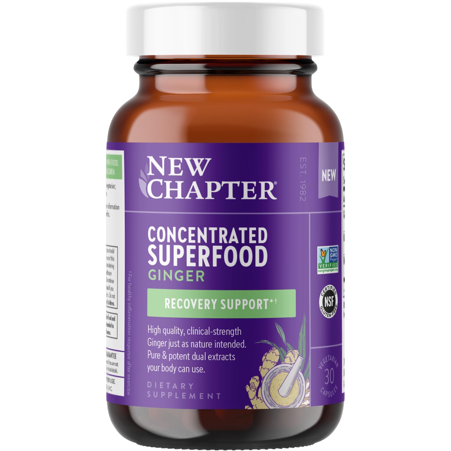 New Chapter Superfood Ginger Capsules provide a concentrated, clinical-strength dose of ginger root in an easy once-daily vegetarian capsule. This superfood formula is crafted to support the body's natural, healthy inflammation response and help with overall balance and recovery, including muscle recovery after exercise.*\u2020 The capsules offer a simple way to enjoy ginger's benefits without the need for powders, teas, or smoothie prep., This supplement features full-spectrum, supercritical extracts of regeneratively farmed ginger, delivering a potent and consistent ginger supply in every serving. The clinical-strength concentration allows you to get a meaningful dose in a small, convenient capsule rather than bulky ginger powder. Regenerative farming practices for the ginger help support healthier soil and more sustainable agriculture. The formula is Non-GMO Project Verified, 100% vegetarian, certified gluten-free by NSF, and made with no synthetic fillers., Superfood Ginger Capsules are ideal for active individuals looking to support recovery and those seeking everyday wellness support through superfood ingredients. They suit people who prefer a capsule over strongly flavored ginger drinks or powders, and who value vegetarian and gluten-free products. As with any supplement, individuals who are pregnant, nursing, taking medications, or have a medical condition should consult a healthcare professional before use.