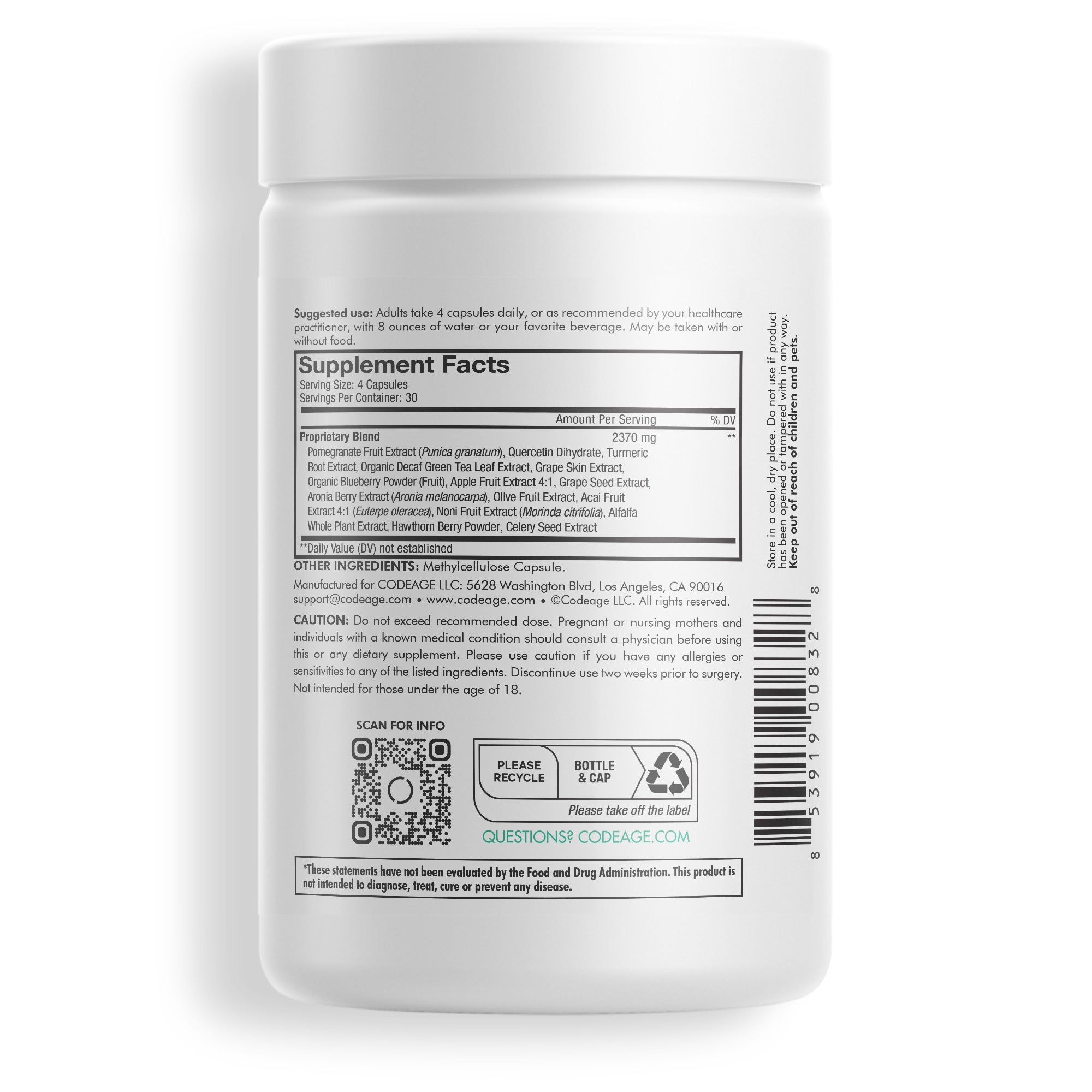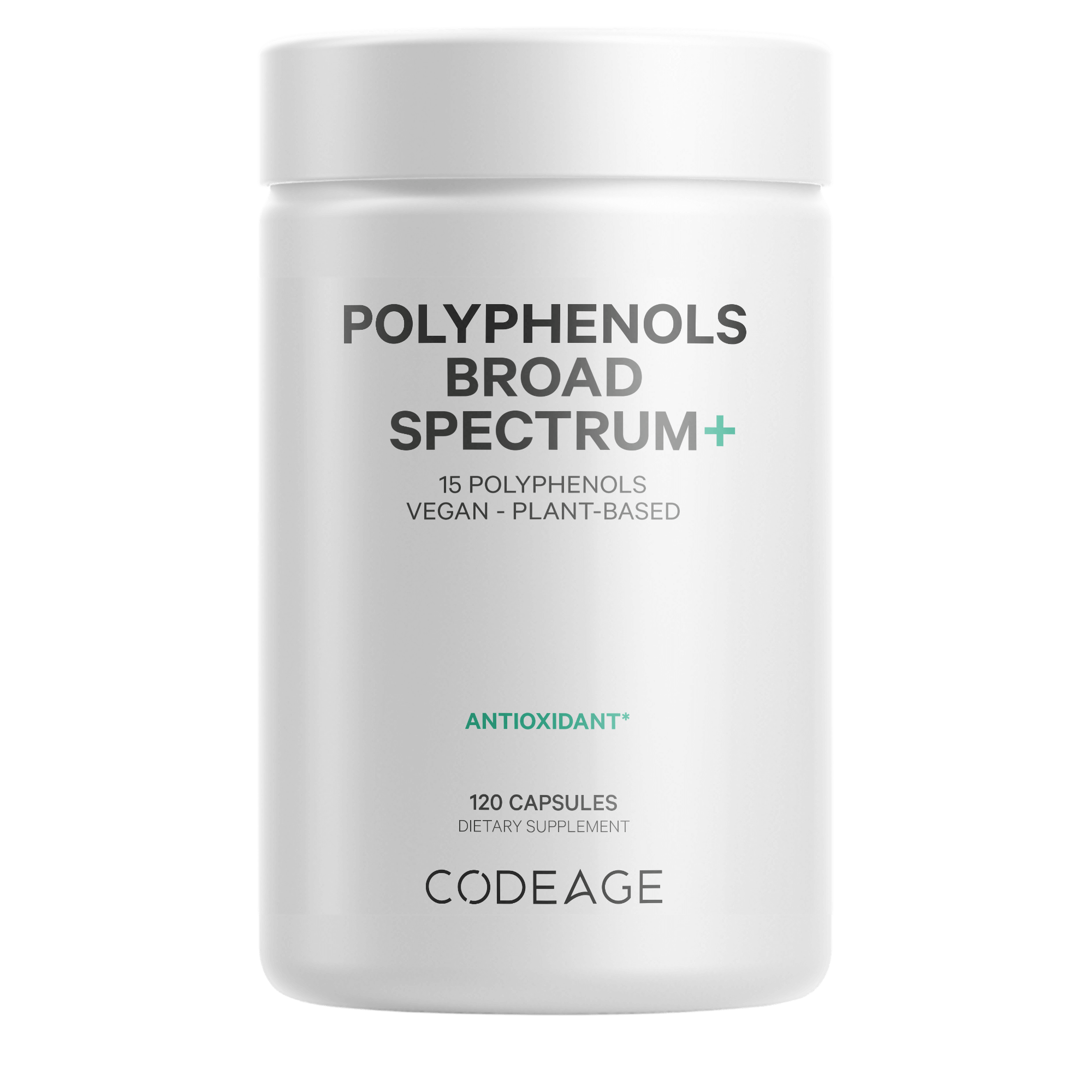 Codeage Polyphenols Broad Spectrum+ is a premium plant-based supplement featuring a diverse blend of 15 polyphenol-rich botanical extracts. This advanced formula includes ingredients such as organic decaf green tea, quercetin, turmeric, pomegranate, grape, and açai, offering a wide range of naturally occurring compounds known for their antioxidant properties. Designed for wellness-conscious individuals, this vegan and non-GMO supplement is free from dairy, soy, gluten, and artificial additives. Manufactured in a cGMP-certified facility in the USA using global ingredients, it supports everyday vitality through a broad spectrum of nutrient-dense plant extracts.