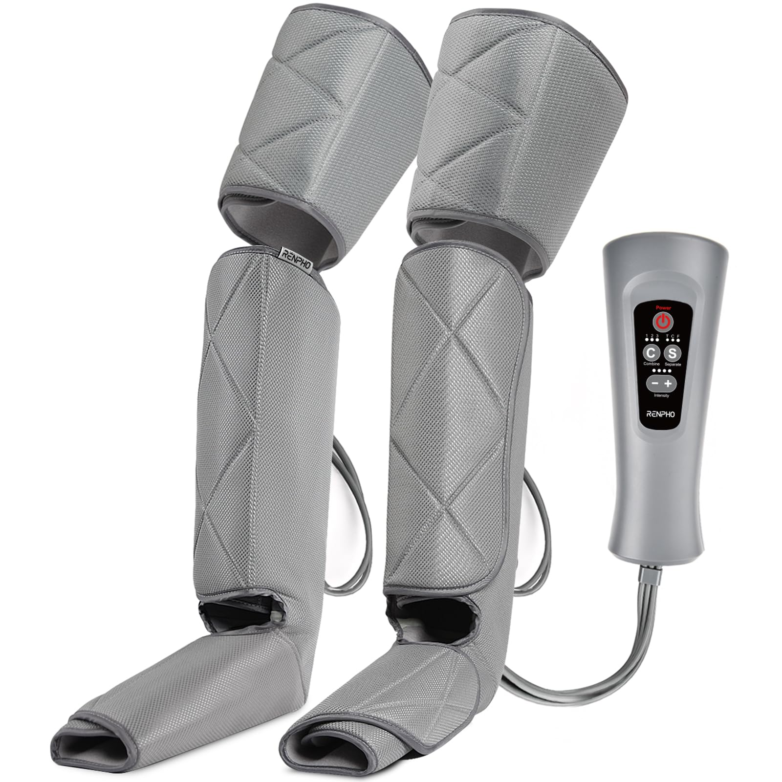 The RENPHO air compression leg massager is designed to massage your feet, calves, and thighs using wrap-around sleeves. It applies rhythmic air compression to help relax your leg muscles after long days of sitting, standing, or activity. With coverage from foot to thigh, it provides a convenient at-home massage experience for the entire lower limb., This device features 6 massage modes and 4 intensity levels, all managed through a portable handheld controller so you can easily customize your session. The air compression system inflates and deflates the chambers in sequence, simulating a kneading and squeezing sensation that can help promote comfort in tired legs. Adjustable Velcro straps allow the calf wraps to fit up to 24.8 inches in circumference and thigh wraps up to 33.5 inches, making it suitable for a wide range of users., The RENPHO leg massager is suitable for adults looking for relaxing leg, calf, and foot massage at home, including those focused on general wellness or recovery after daily activities. It can be a thoughtful gift option for family members or friends who spend long hours on their feet or seated. Always read and follow the user manual, and consult your doctor before use if you have any medical conditions related to circulation or the lower limbs.