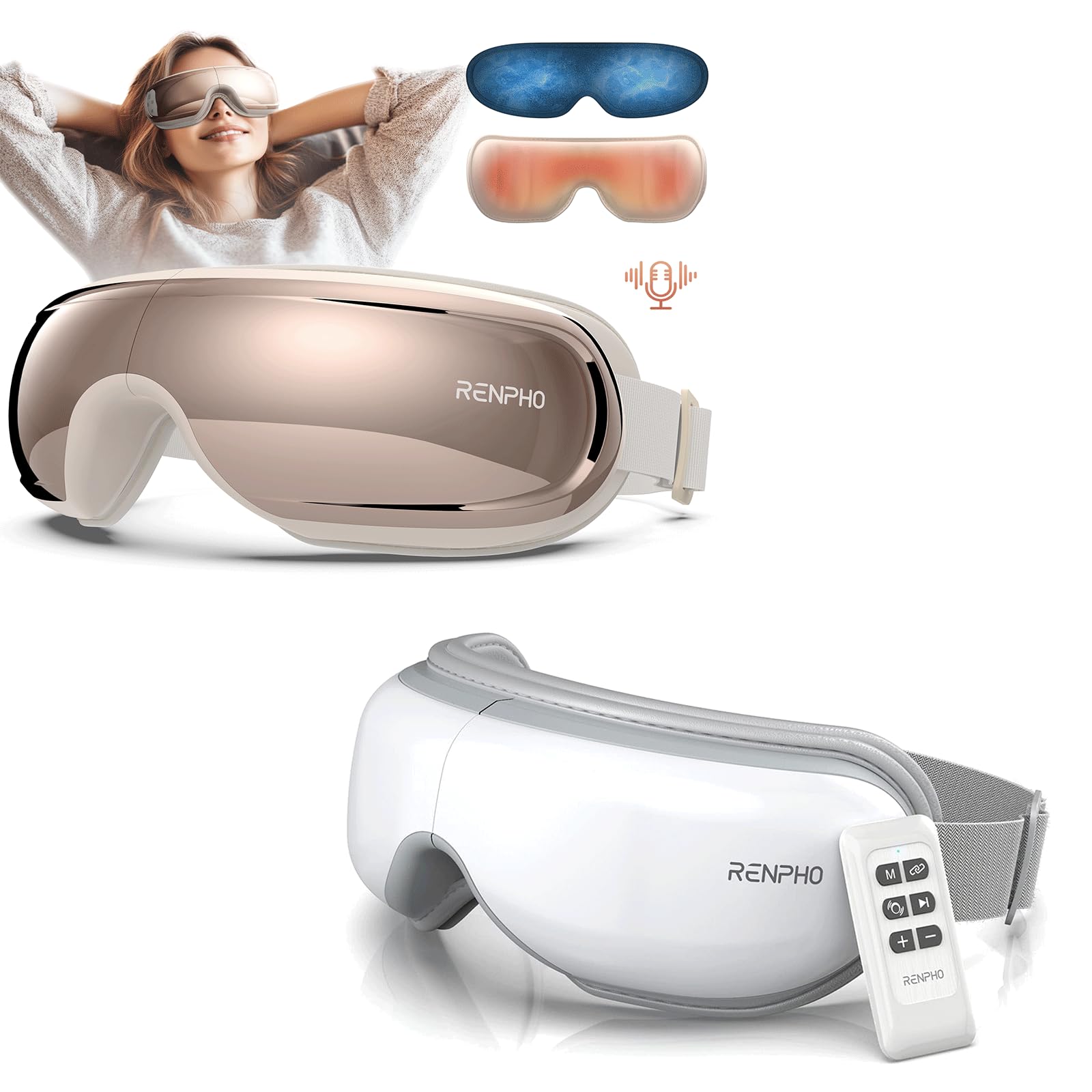 The RENPHO Eye Massager with Heat and Cooling is an electronic eye care device designed to support relaxation around the eyes. It features both warming and cooling functions and includes an ice gel pack, aiming to provide soothing comfort for tired eyes. This device is described for use with eye strain and inflammation support, as well as for migraine-related discomfort., By combining heat and cooling in a single unit, this eye massager offers versatile temperature-based comfort options. The included ice gel pack can provide an additional cooling sensation, while built-in voice control allows you to adjust settings hands-free when supported. These features are intended to make at-home eye care more convenient, helping you create a calming routine for your eyes after work, screen time, or daily activities., This eye massager is suited for adults seeking non-invasive support for eye strain, general eye-area relaxation, and comfort during migraine episodes. It can fit into a broader wellness or self-care routine for people who spend long hours reading, studying, or working on digital devices. Individuals with eye conditions or recent eye surgery should consult a healthcare professional before use.