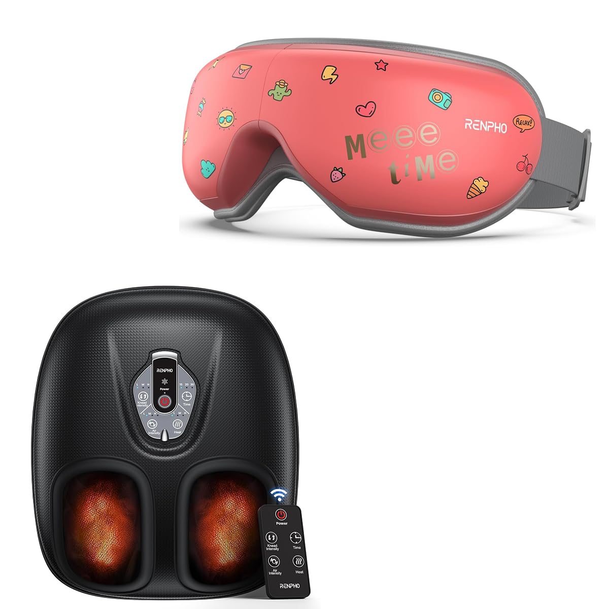 The RENPHO Foot Massager Machine with Heat and Eyeris 1 Eye Massager with Heat set combines two home relaxation devices in one bundle. The foot massager is designed to provide heated foot comfort, while the Eyeris 1 eye massager offers heated eye relaxation. This pairing is positioned as a thoughtful gift option for mothers, fathers, and other family members., The foot massager machine includes a heating function aimed at delivering a warm, soothing experience to the feet. The Eyeris 1 eye massager similarly incorporates heat to gently warm the eye area during use. By combining a heated foot massager and a heated eye massager, this set allows users to enjoy targeted relaxation for both feet and eyes in a home setting. Exact technical specifications, massage modes, and intensity options are not provided in the available description., This product bundle is intended for adults seeking convenient at\u2011home comfort for their feet and eye area. It can be considered by individuals interested in gifting wellness and relaxation devices to parents, spouses, or friends. Users should follow all included safety and usage instructions and discontinue use if they experience discomfort.