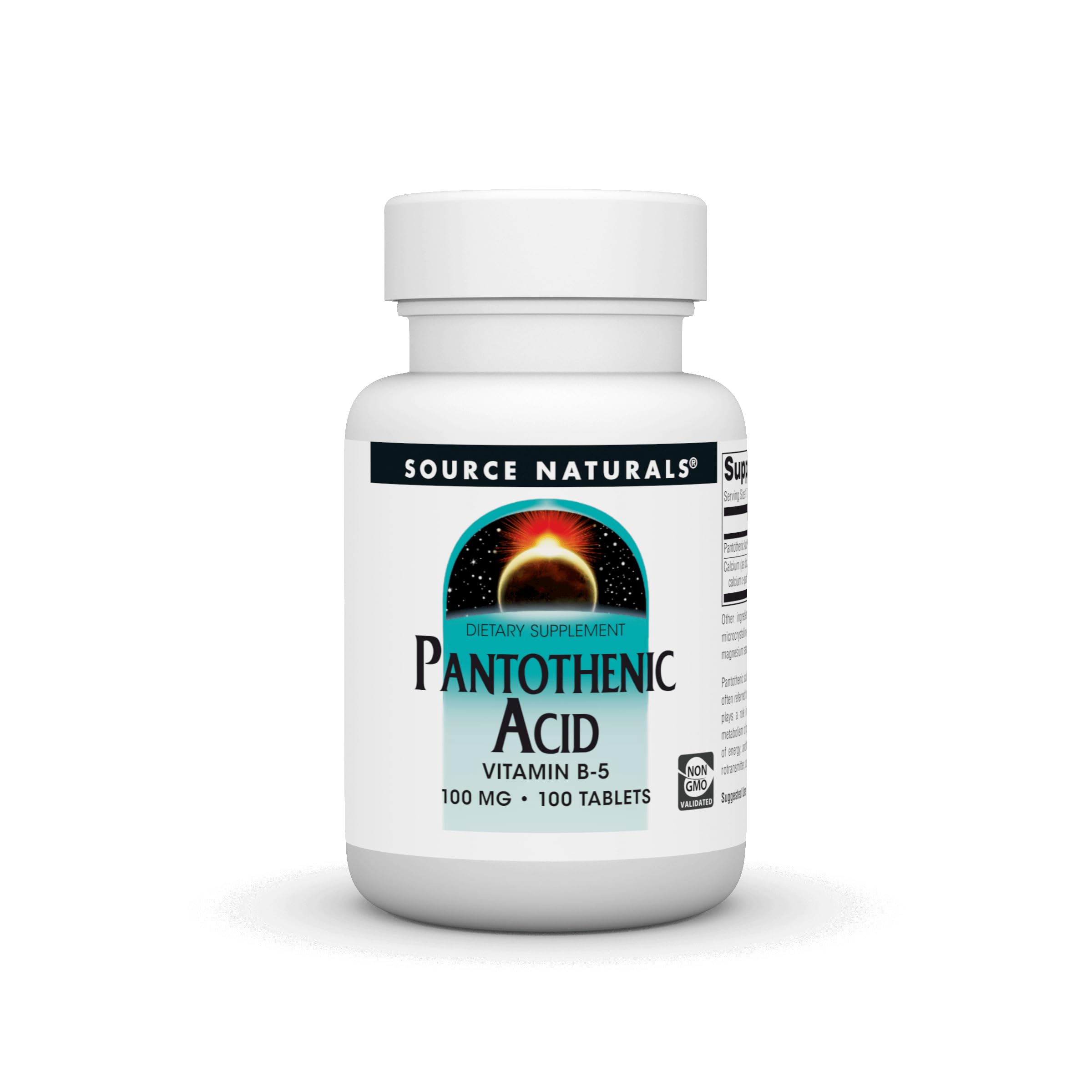 Source Naturals Pantothenic Acid provides 100 mg of vitamin B-5 per tablet. Pantothenic acid supports the metabolism of proteins, fats, and carbohydrates and plays roles in energy production and red blood cell synthesis.