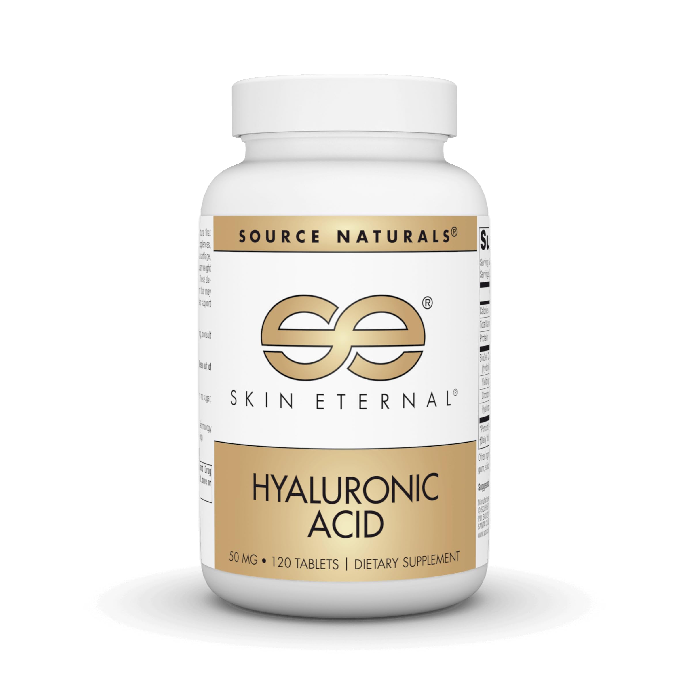 Source Naturals Skin Eternal Hyaluronic Acid is a specialized supplement formulated to support skin structure. Each tablet provides 50 mg of hyaluronic acid, a key component of skin that naturally changes as we age. The formula is designed for individuals seeking nutritional support for skin integrity and appearance., This product features patented BioCell Collagen, made from 100% pure cartilage that has undergone a hydrolysis process. This process yields low molecular weight hyaluronic acid, chondroitin sulfate, and collagen type II peptides, which are more easily utilized by the body compared to larger molecules. Hyaluronic acid and collagen are vital constituents of the skin's extracellular matrix, helping to maintain hydration and resilience. By combining these components in a single formula, Skin Eternal Hyaluronic Acid offers convenient daily support for skin structure from within., Skin Eternal Hyaluronic Acid is suitable for adults who want to support healthy-looking skin and maintain skin structure as part of their general wellness routine. It may be particularly appealing to those focused on beauty from within or healthy aging. As with any supplement, individuals who are pregnant, nursing, taking medications, or have a medical condition should consult a healthcare professional before use.
