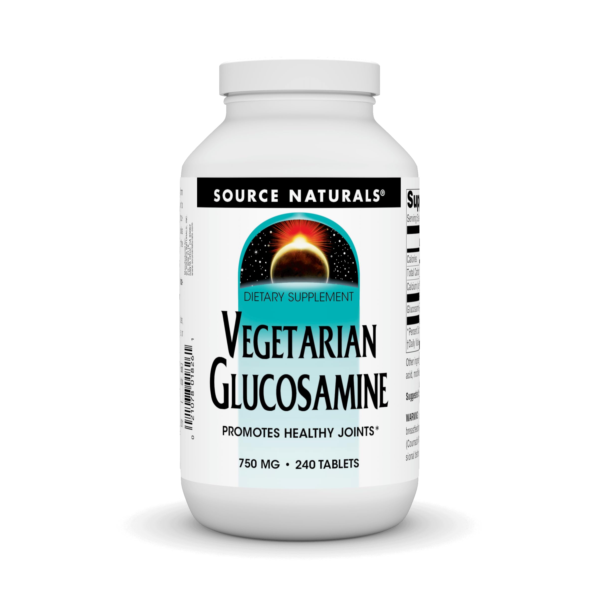 Source Naturals Vegetarian Glucosamine 750 mg is a joint support supplement formulated for those who prefer a plant-based option. Each tablet delivers 750 mg of glucosamine, a key structural component found in glycosaminoglycans. These compounds help retain water and lubricate joints, supporting the healthy structure of your joints and skin., Glucosamine plays a role in forming glycosaminoglycans, which are important building blocks in cartilage and connective tissues. By helping these tissues hold water, glucosamine contributes to cushioning and flexibility in the joints. This vegetarian formula is designed for those who avoid shellfish-derived glucosamine and is produced without sugar, starch, preservatives, or artificial colors, flavors, or fragrances. It is also free from yeast, dairy, egg, gluten, soy, and wheat, making it suitable for many dietary needs., This product is ideal for adults who want everyday support for joint comfort and mobility as part of a general wellness routine. It may be especially appealing to vegetarians and those who are sensitive to common allergens. As with any supplement, individuals with medical conditions or those taking medications should consult a healthcare professional before use.