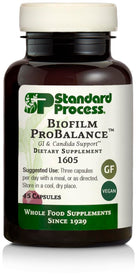 Standard Process Biofilm ProBalance is a digestive wellness supplement formulated with probiotics to support gut health and microbiome balance. Each bottle provides 45 capsules, delivering 15 servings aimed at aiding intestinal comfort as part of a daily wellness routine. The product is labeled gluten-free and vegan, offering an option for those with specific dietary preferences., Probiotics are live microorganisms that, when consumed in adequate amounts, can support a balanced intestinal environment and contribute to digestive wellness. By focusing on microbiome support, Biofilm ProBalance is intended to help maintain a healthy population of beneficial bacteria in the gut. The formula is presented in convenient capsules, making it easy to incorporate into existing supplement regimens while following the suggested use on the product label., Biofilm ProBalance is suitable for adults seeking additional digestive and microbiome support as part of a general wellness plan. It may be of particular interest to those focused on gut health, digestive comfort, or following gluten-free or vegan dietary patterns. Individuals with medical conditions, those who are pregnant or nursing, or taking medications should consult their healthcare provider before use.