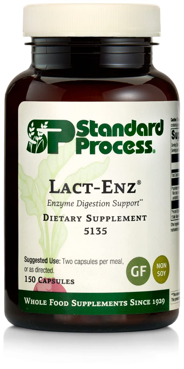 Standard Process Lact-ENZ is a digestive support supplement combining enzymes and probiotic care in convenient capsules. It is formulated to provide support during the gastric and intestinal phases of digestion. The product is described as gluten-free, non-dairy, and non-soy, making it suitable for those with specific dietary preferences., This digestive formula is designed to help the body process foods more efficiently by supplying targeted digestive support. By supporting enzyme activity and probiotic balance, it contributes to overall digestive comfort and function. The product also supports healthy immune system function, reflecting the close relationship between the gut and immune health. Standard Process emphasizes high-quality products made to work in harmony with the body's natural processes., Lact-ENZ is suited for individuals seeking extra digestive support with their meals and those who want a formula that is gluten-free, non-dairy, and non-soy. It can fit into general wellness routines, especially for people focused on digestive comfort and maintaining everyday immune function. As with any supplement, individuals with medical conditions or those taking medications should consult a healthcare professional before use.