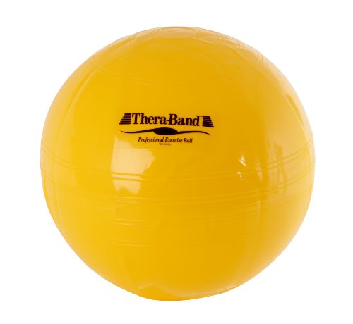 The TheraBand Gym Exercise Ball is a 45 cm yellow stability ball designed to support full-body conditioning and core training. Suitable for individuals between 4'7\ and 5' tall (139.7\u2013152.4 cm), it is commonly used for strength, balance, posture, and flexibility exercises at home, in the gym, or in rehab settings. This versatile ball can be used by both men and women to help build and maintain core stability., Stability balls like this TheraBand model create an unstable surface that engages multiple muscle groups at once, especially the abdominals, back, hips, and glutes. By challenging your balance, the ball encourages better posture and alignment while you perform exercises or stretches. It comes deflated for convenient storage and transport, and includes two plugs, an inflation adaptor, and a 24-exercise guide poster to help you get started safely and effectively. The Power Pump for inflating the ball is sold separately., This exercise ball is ideal for anyone looking to integrate stability training into their workout or rehabilitation routine. It is especially useful for general wellness users, fitness enthusiasts, and those working on core strength, posture, or flexibility. Always follow the included exercise guide and consult a professional if you are using the ball as part of a rehab program or have existing back or spine concerns.