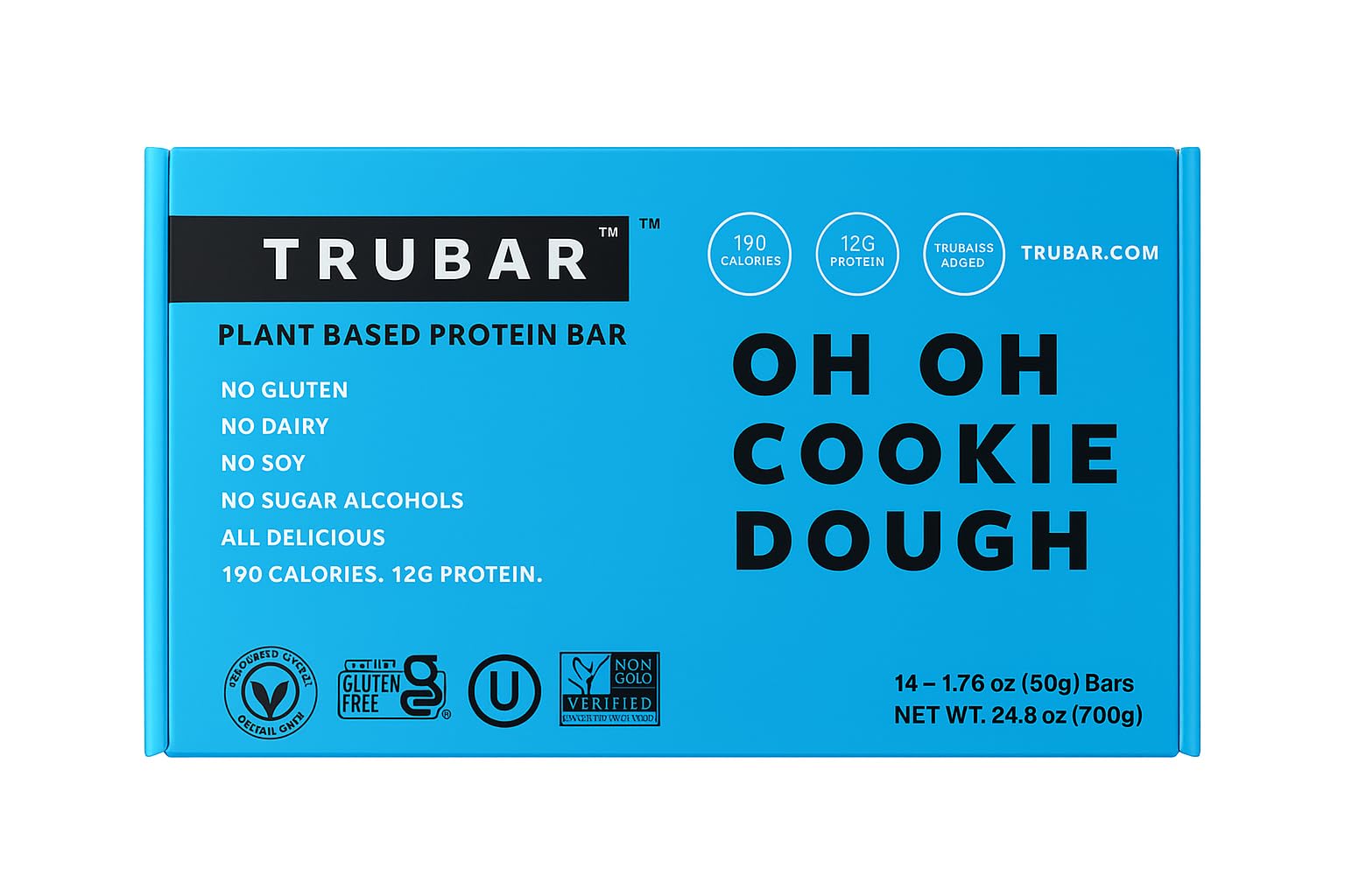 TRUBAR Oh Oh Cookie Dough Protein Bar is a plant-based snack bar inspired by classic cookie dough flavor. Each bar is designed as a sweet dessert-style alternative that also delivers protein and fiber for everyday snacking. With 14 bars per box, it offers a convenient option for on-the-go enjoyment at breakfast, after workouts, or between meals., This vegan protein bar blends real ingredients such as cashews, cassava, and pea protein to provide 12g of plant-based protein and 12\u201313g of fiber per serving. The formula is gluten free, dairy free, soy free, non-GMO, and made without sugar alcohols, supporting those who look for simple ingredient lists. At about 190 calories per bar, it aims to balance indulgent taste with mindful nutrition for those who want a treat-like experience that still fits their daily goals., TRUBAR Oh Oh Cookie Dough is suited to anyone seeking a plant-based, cookie-dough flavored bar for general wellness, fitness support, or busy lifestyles. It can appeal to runners, strength training enthusiasts, and those simply wanting a satisfying, portable snack that aligns with gluten free or dairy free preferences. As with any packaged food, individuals with specific allergies or medical conditions should check the full ingredient list before consuming.