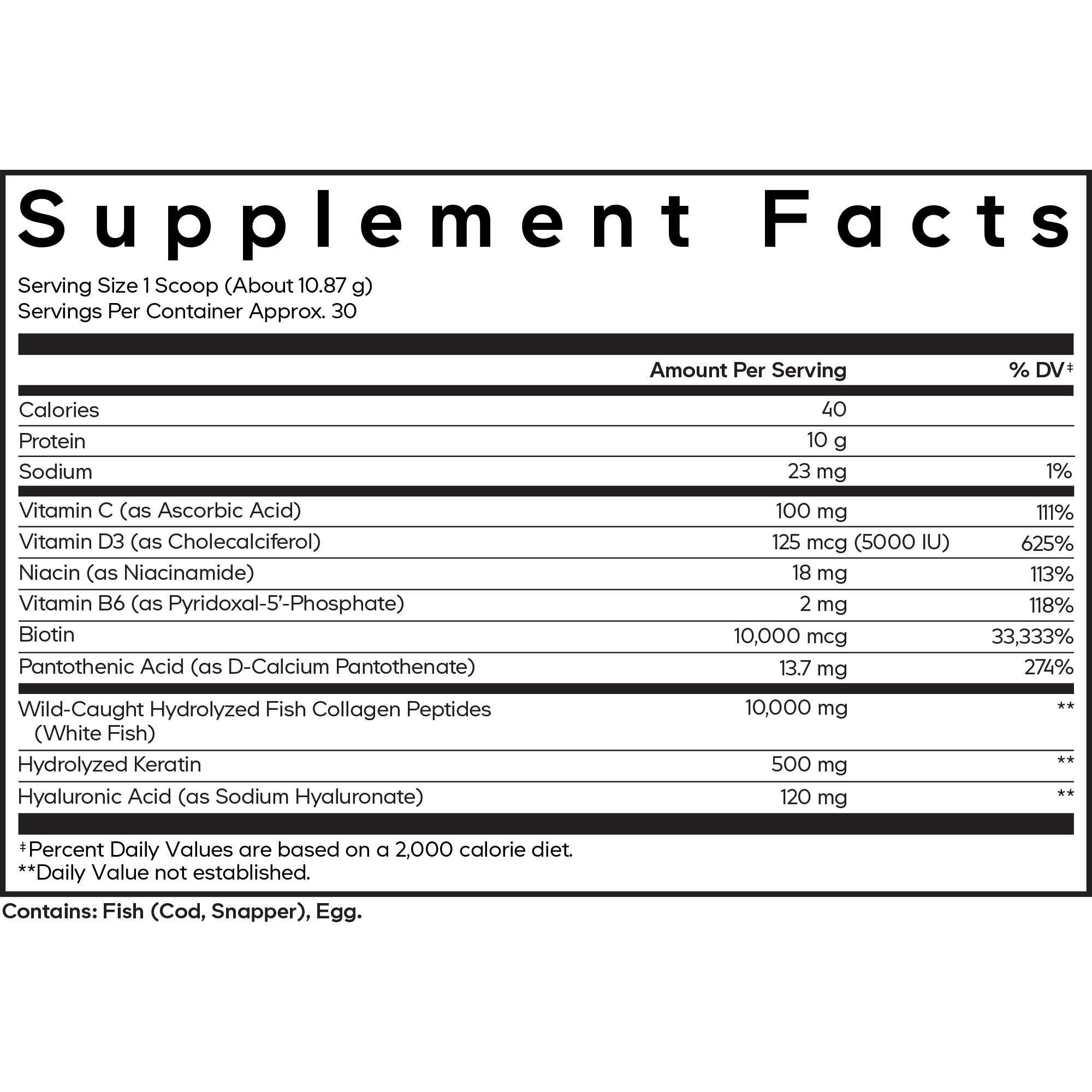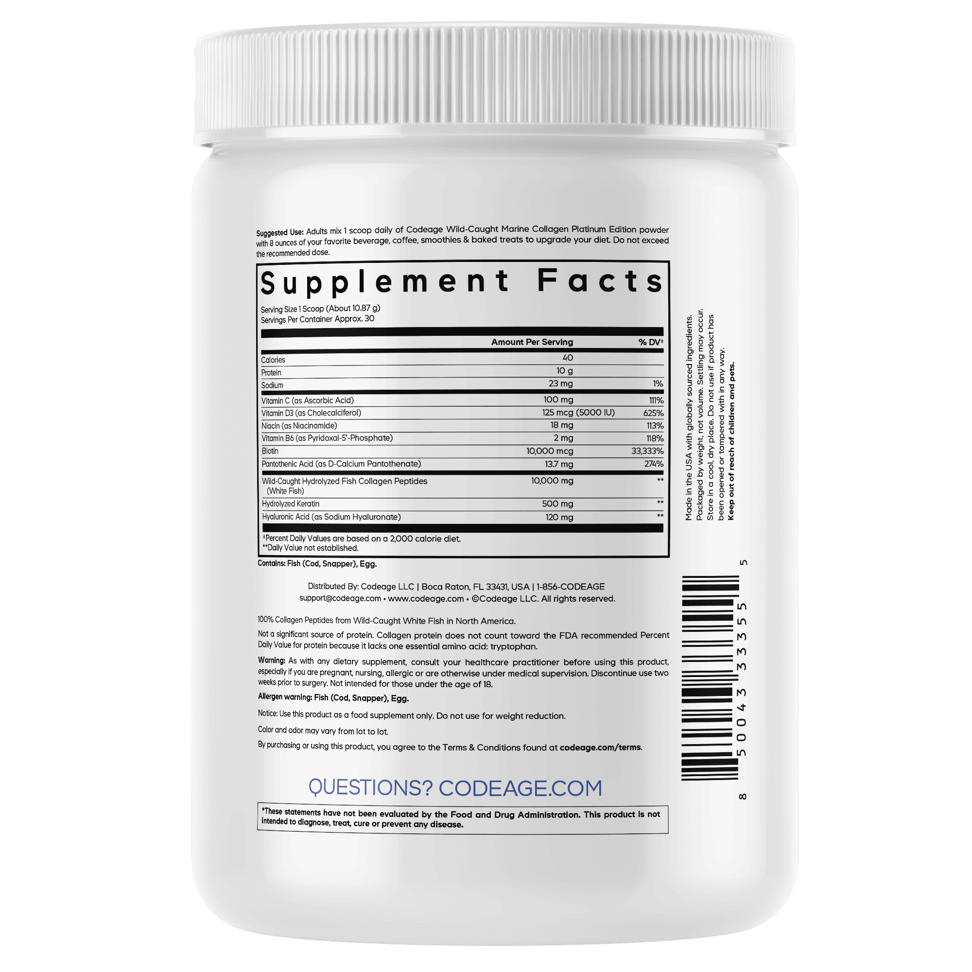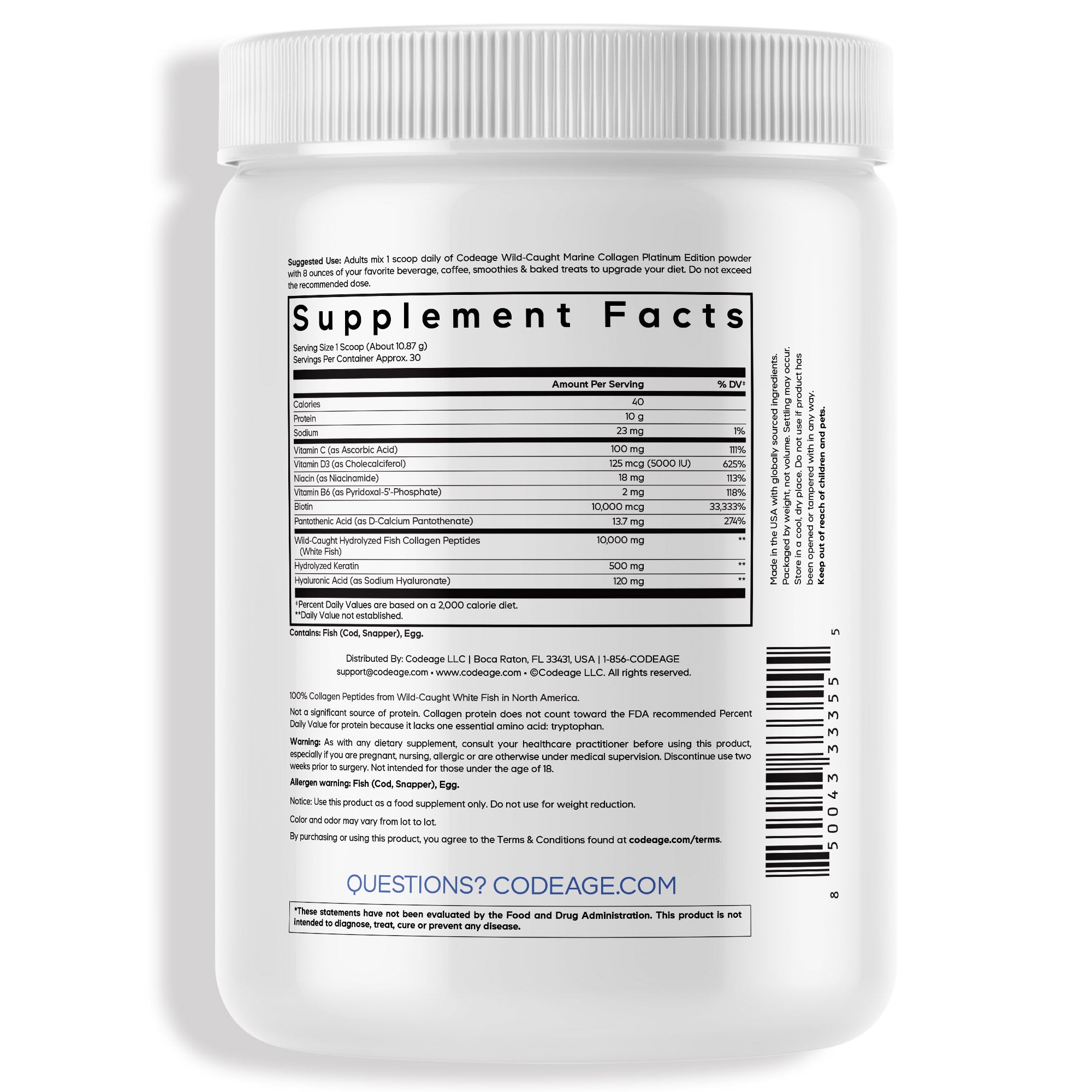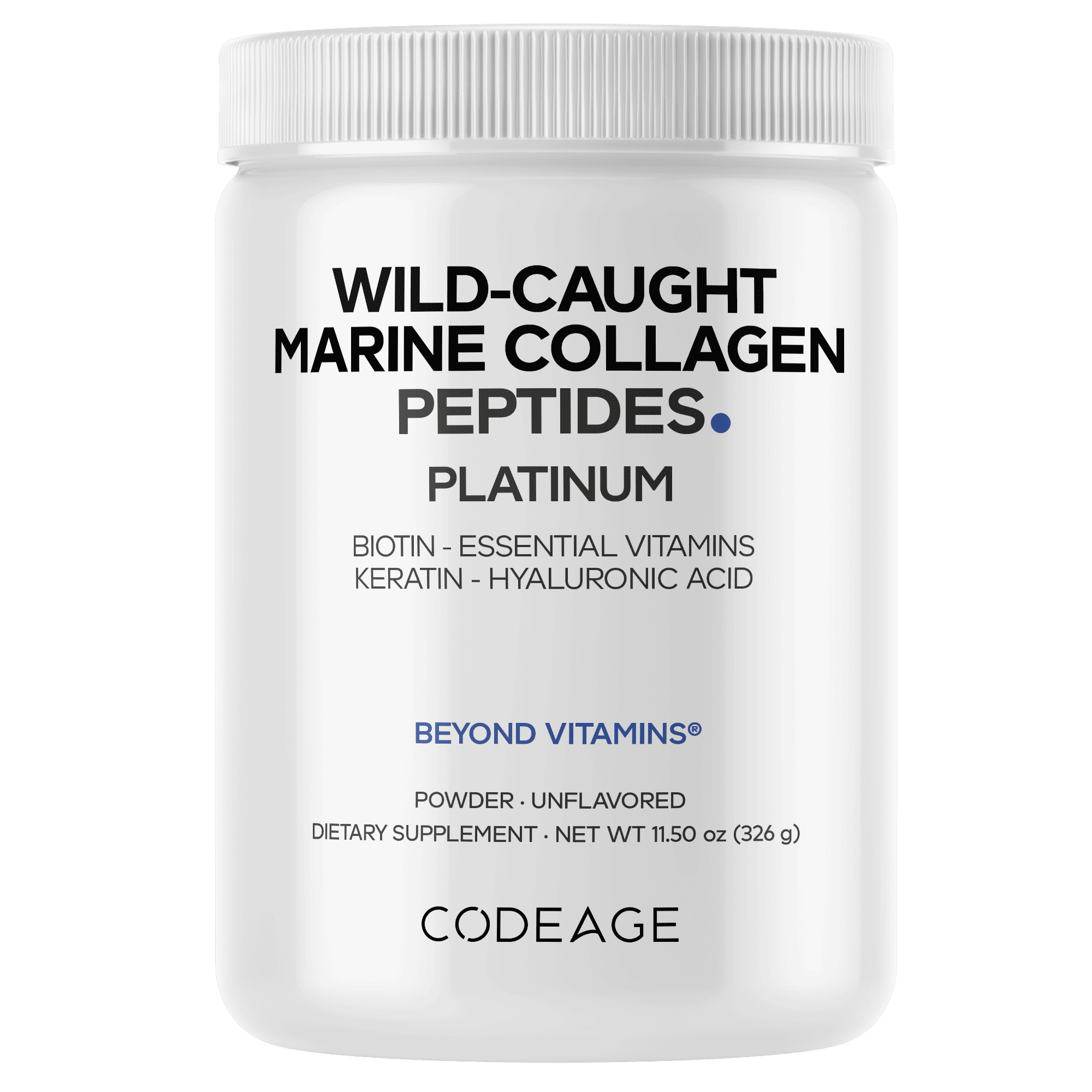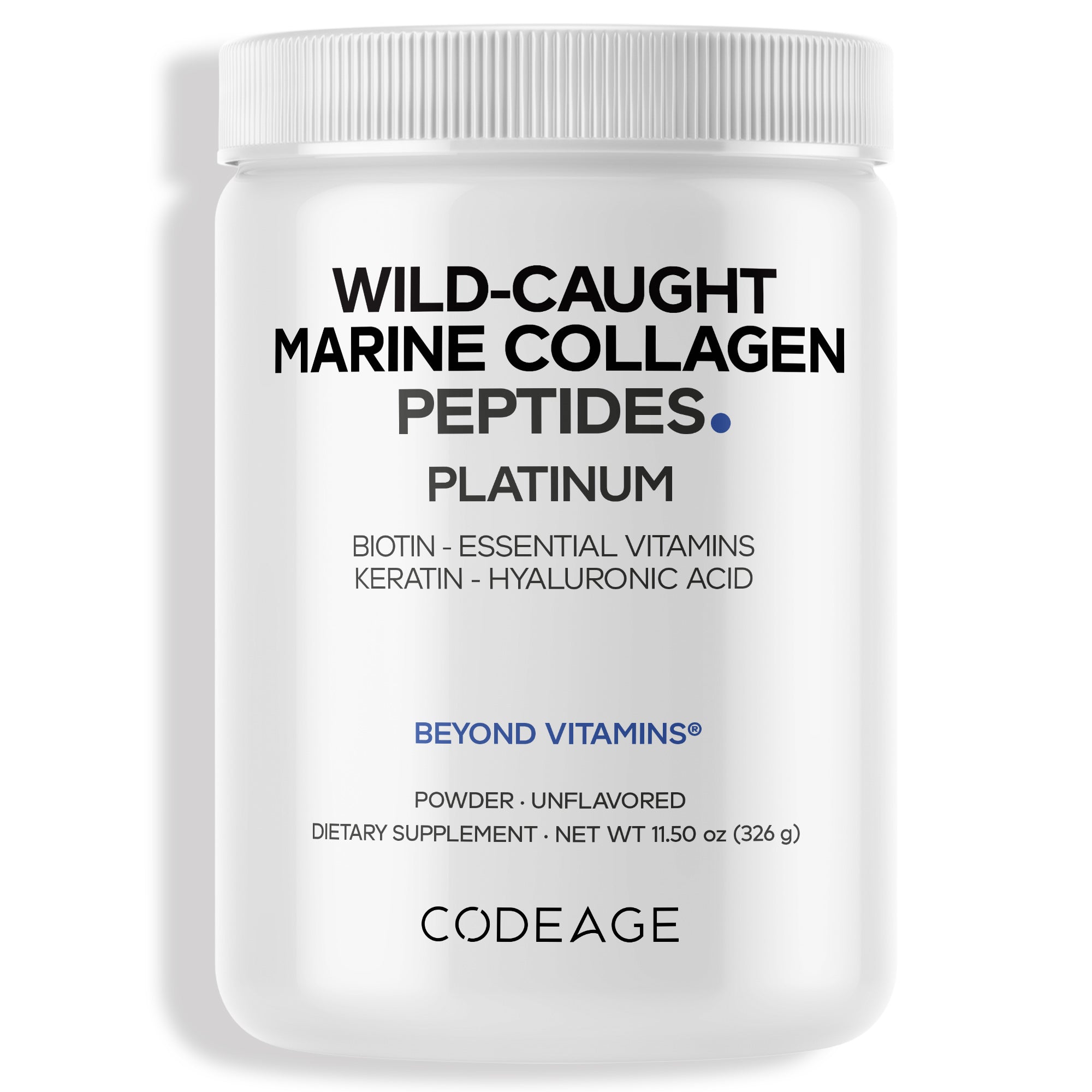Support your wellness routine with Codeage Marine Collagen Peptides Powder Platinum – a premium collagen supplement made from wild-caught North American white fish. Featuring hydrolyzed fish collagen types 1 and 3, this advanced formula is enriched with 10,000 mcg of biotin, vitamin C, vitamin D3, vitamin B6, niacin, pantothenic acid, hydrolyzed keratin, and hyaluronic acid. Designed to help support skin, hair, nails, and joints, this formula delivers 18 amino acids and is free from dairy, soy, gluten, and shellfish.