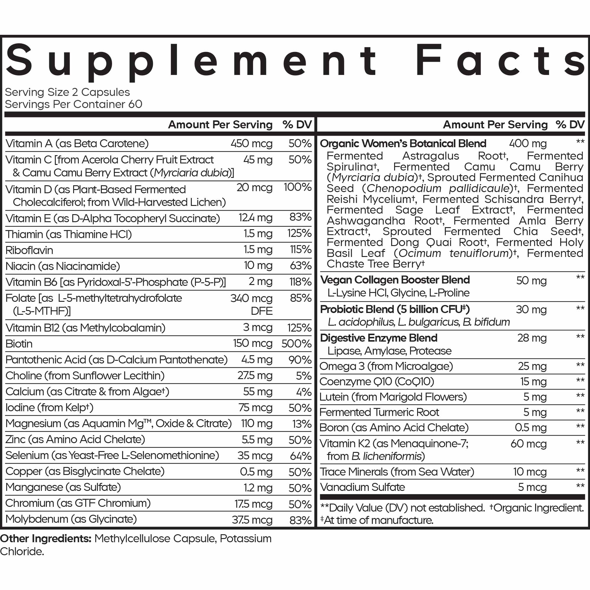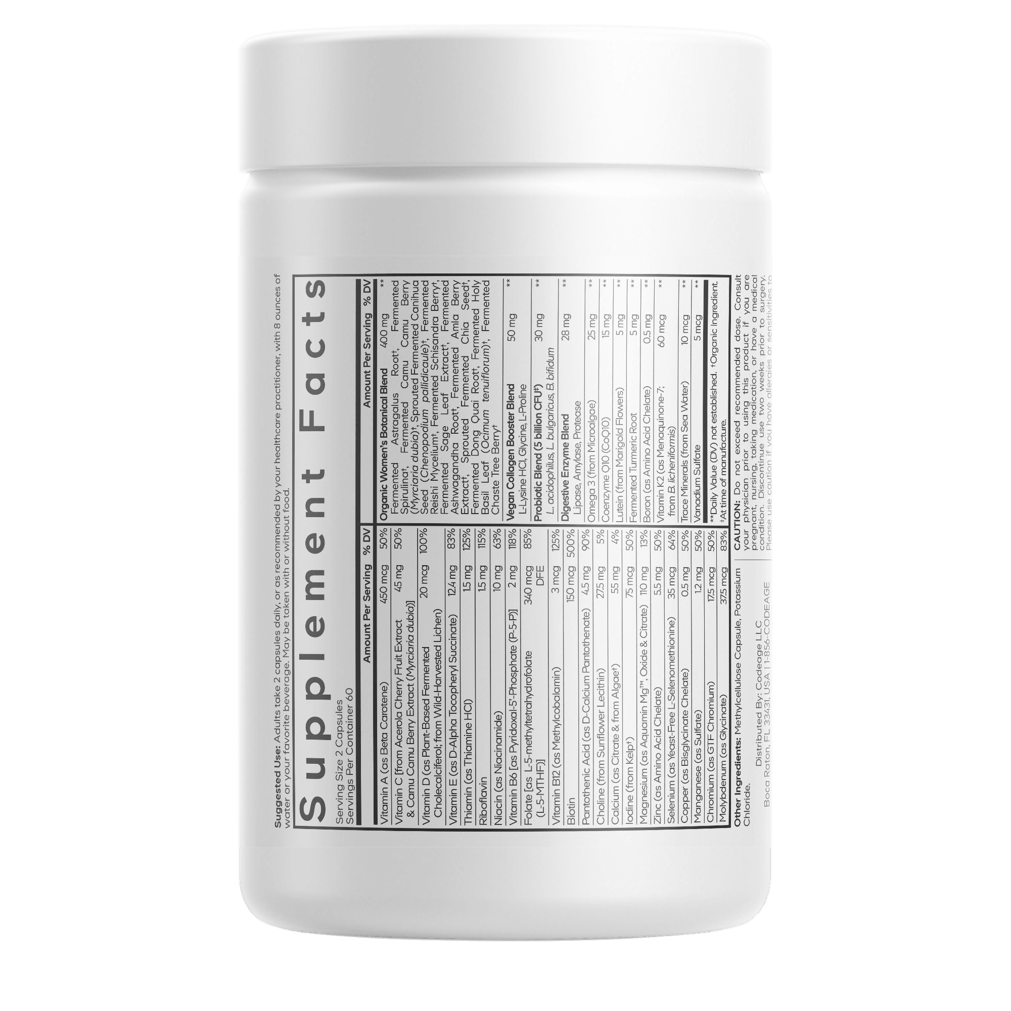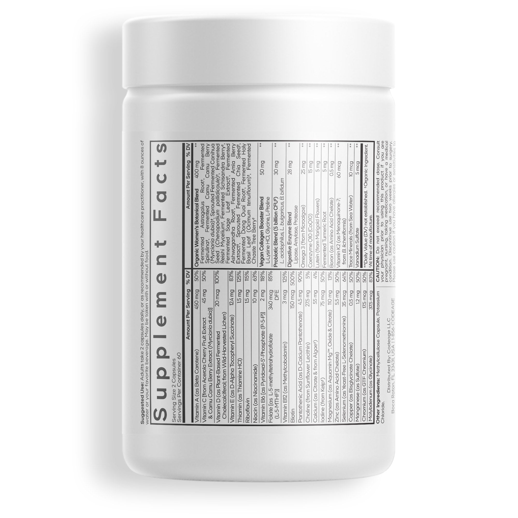 Comprehensive women's multivitamin with 25+ nutrients, organic botanicals, probiotics, and omega-3 for daily wellness support.