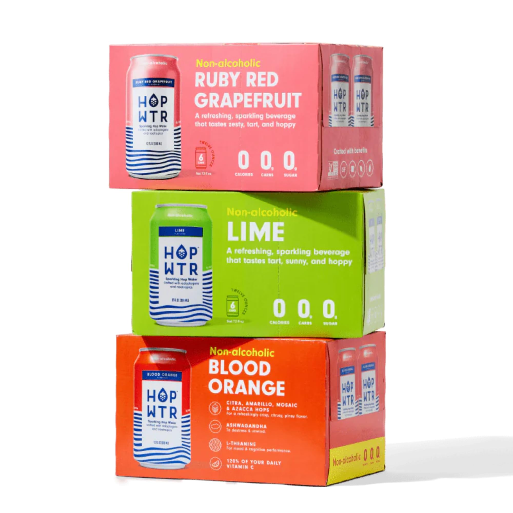 POSITIVELY REFRESHING: HOP WTR is more than just an alcohol alternative, it’s a healthy upgrade to your soda, seltzer water or flavored sparkling water. Non-alcoholic and crafted without calories, carbs, sugar, or gluten, our non-alcoholic beverages are a choice you can feel great about physically, mentally, and emotionally. Cheers to a life well sipped!. ADAPTOGENS AND NOOTROPICS: Each can of HOPWTR is infused with our proprietary blend of adaptogens and nootropics that features ashwagandha and L-Theanine. BREWER-APPROVED HOP BLEND: Our zero carb brews are infused with a blend of Citra, Amarillo, Mosaic, and Azacca hops to deliver a bold and piney flavor reminiscent of your favorite IPA. SPARKLING HOP WATER: HOPWTR is a hop-infused sparkling water crafted with adaptogens and nootropics. Our hop blend is paired with ashwagandha and L-Theanine, providing sugar free, hop-filled refreshment without the alcohol.