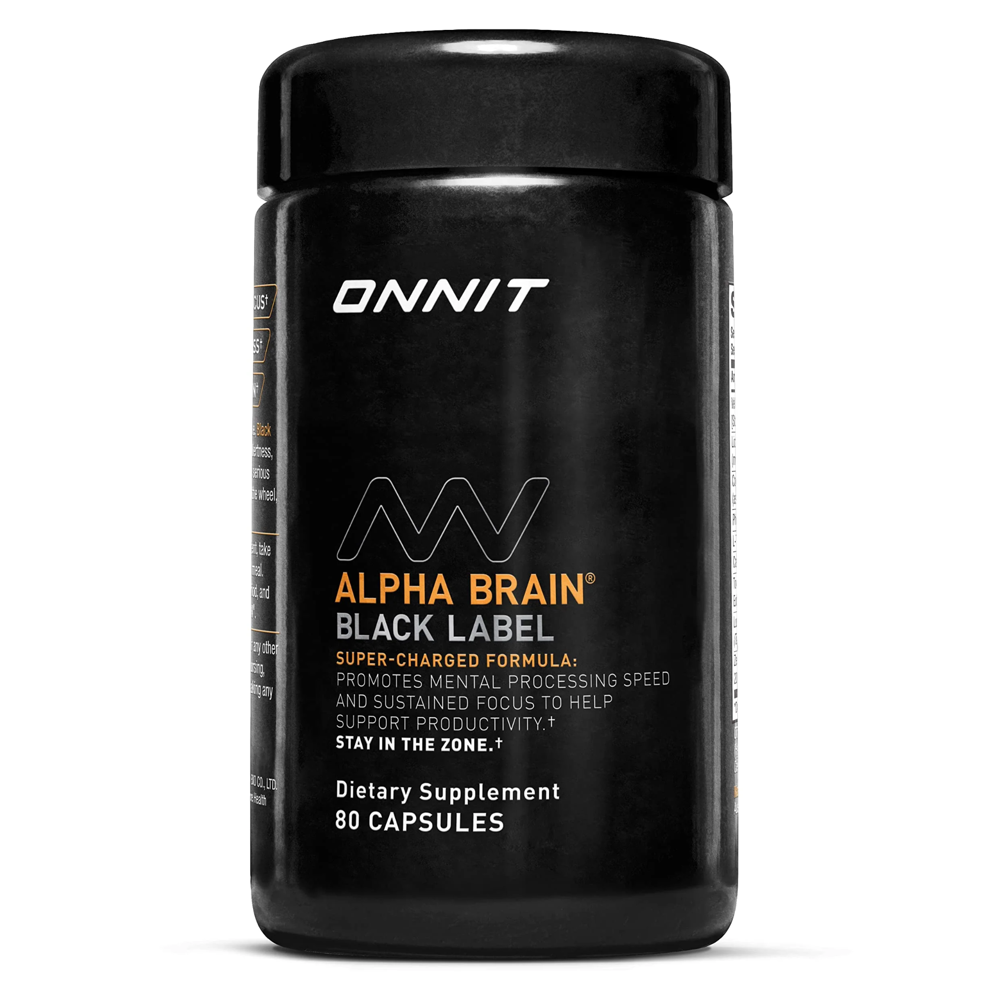 Alpha BRAIN® Black Label by Onnit is a high-performance nootropic formulated to support mental clarity, focus, and sustained alertness throughout the day. Designed for individuals seeking to optimize brain performance, this advanced formula features clinically studied ingredients such as COGNIZIN® Citicoline and L-Theanine, which promote calm yet focused energy. Caffeine Anhydrous provides steady mental alertness, while Phosphatidylserine contributes to healthy brain cell communication. Additional key ingredients like Mucuna Pruriens and Huperzia Serrata support healthy neurotransmitter activity and memory function, while Lutemax 2020® helps reduce occasional eye strain from extended screen time. With 80 capsules per bottle, Alpha BRAIN® Black Label fits seamlessly into your daily wellness routine to help keep you mentally prepared for demanding tasks.