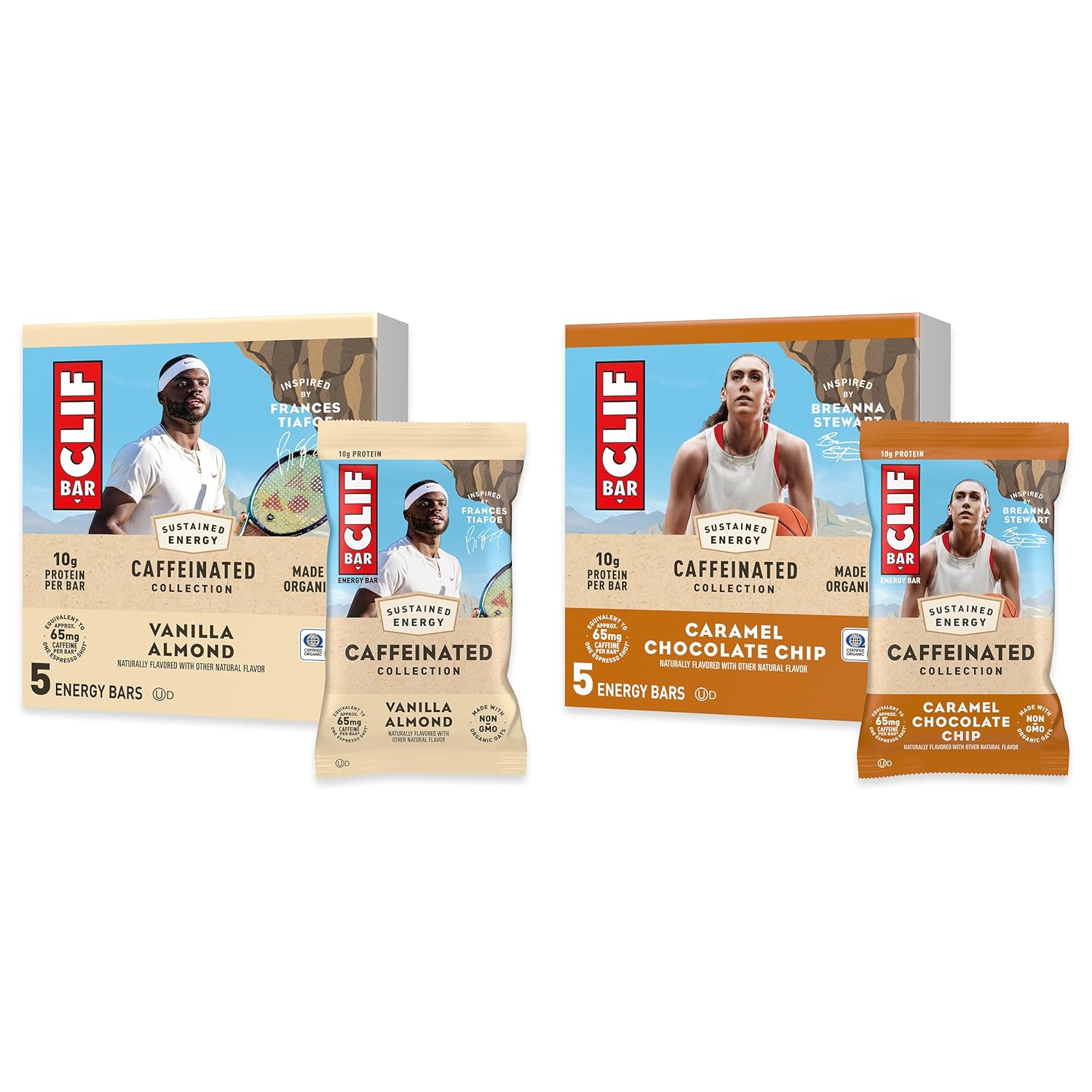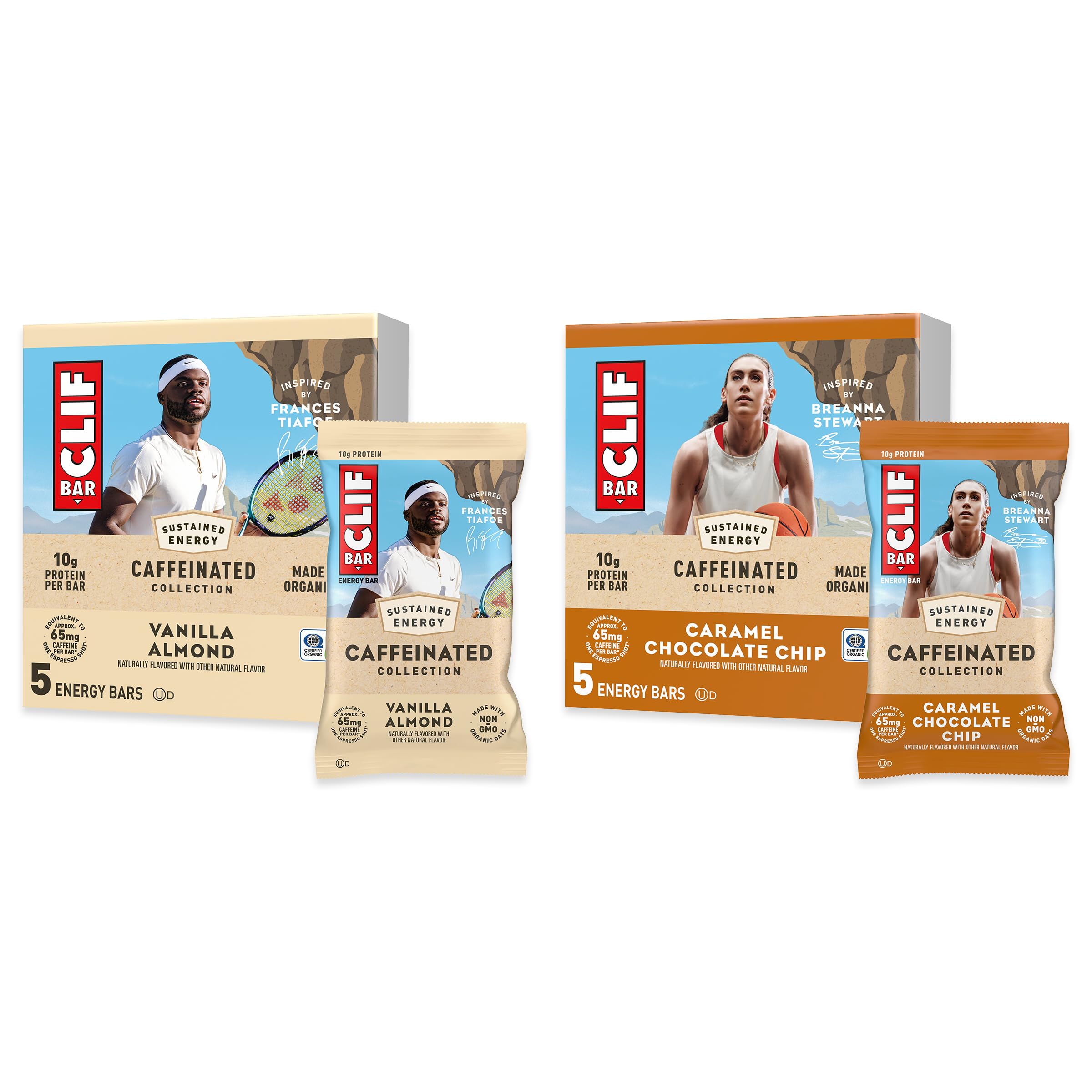 Start Strong with CLIF BAR Caffeinated Collection. Inspired by elite athletes Frances Tiafoe and Breanna Stewart, CLIF BAR Caramel Chocolate Chip and Vanilla Almond Flavor caffeinated energy bars are purposefully crafted with a mix of protein, fat, and carbohydrates to help sustain active bodies before and during long-lasting activity. CLIF BAR energy bars are made with quality ingredients like wholesome organic rolled oats and no high-fructose corn syrup, and they are non-GMO and plant-based for a granola bar you can feel good about. With 65 mg of caffeine* per bar (equivalent to the amount in one espresso shot) for an added boost, CLIF Caffeinated Collection has caffeine to get you started, and sustained energy to keep you going. As part of the CLIF brand mission, our 2 LEED-certified bakeries and Emeryville, CA, office run with the help of on-site solar arrays and/or offset electricity through the purchase of renewable energy credits (RECs). From CLIF BAR Energy Bars to Builders Protein Bars and Zbar Snack Bars, CLIF brands turn grabbing a bar into raising your bar. *Caffeine can range from 60-70 mg. Not recommended for pregnant or nursing women, children under 18 years old, or people sensitive to caffeine.
