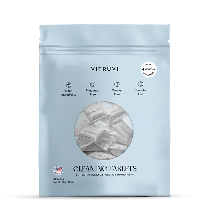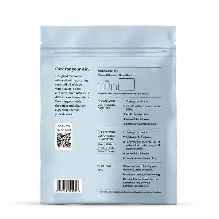 Keep your diffuser or humidifier in its best condition with Vitruvi Cleaning Tablets. Designed to eliminate hard water stains, essential oil residue, and mineral buildup, these tablets improve performance, maintain scent purity, and prolong the life of your Diffuser or Humidifier. In just a few minutes, these tablet provide hassle-free clean that’s safe, non-toxic, fragrance-free, and cruelty-free. Made with natural ingredients, these tablets are an easy addition.