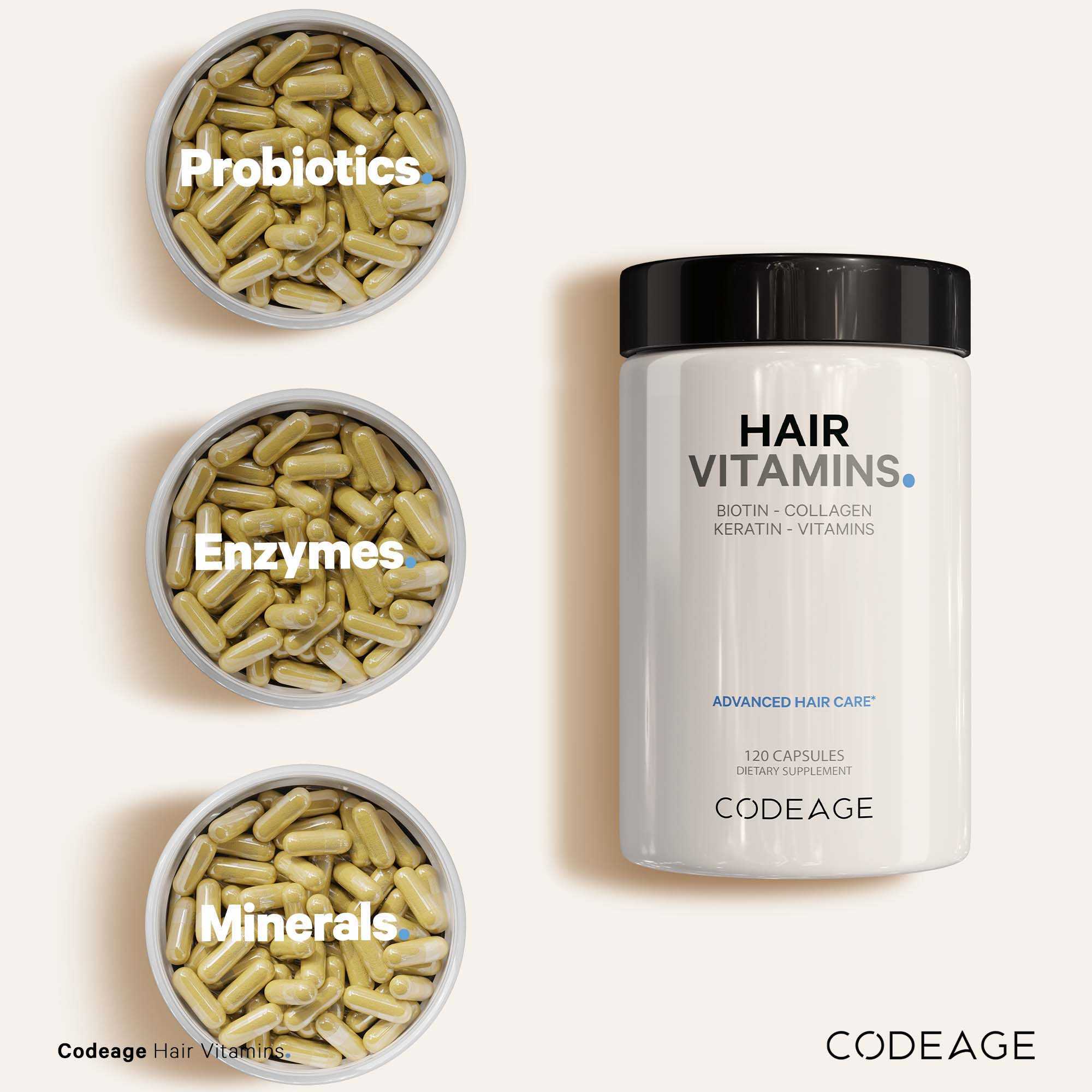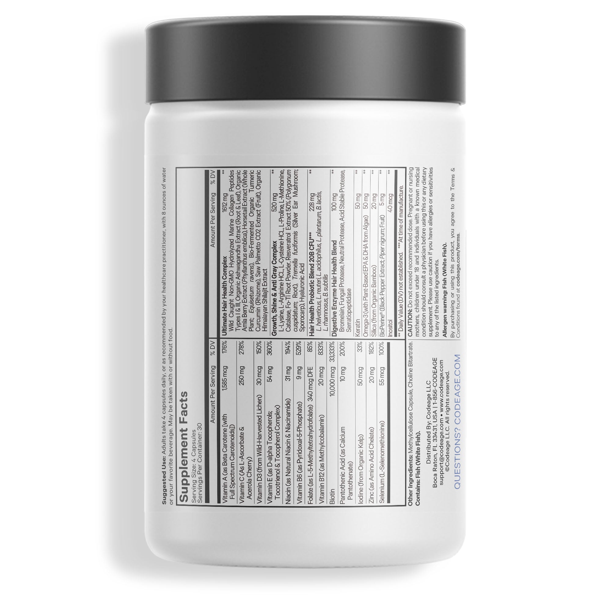 Support your hair care routine with Codeage Hair Support Supplement, a premium formula designed for men and women of all hair types and colors. Each serving delivers 10,000 mcg of biotin alongside marine collagen types I & III, keratin, and a wide spectrum of essential vitamins and nutrients. This advanced blend also includes hyaluronic acid, omega-3 from algae, probiotics, and plant-based extracts such as turmeric, amla berry, and ashwagandha.