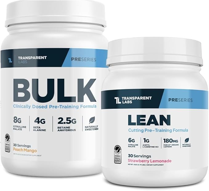 Transparent Labs Bulk & Lean Pre-Workout Bundle provides two complementary pre-workout formulas in one package, containing key performance ingredients including citrulline, beta-alanine, and natural caffeine.