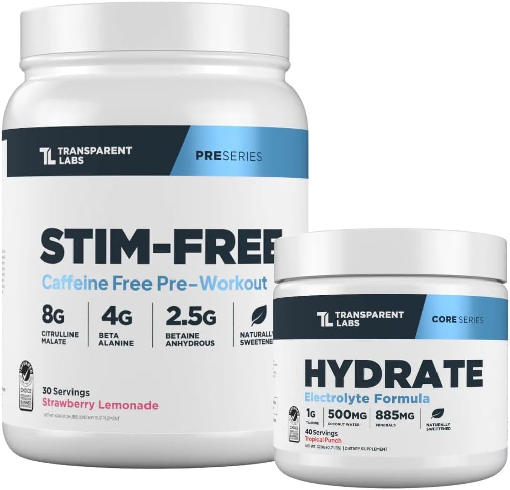 Transparent Labs Stim-Free Pre-Workout & Hydrate Bundle combines a stimulant-free pre-workout formula with an electrolyte hydration powder, delivered in convenient powder form for athletes who train later in the day or prefer to avoid caffeine.