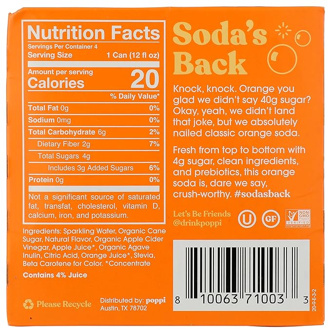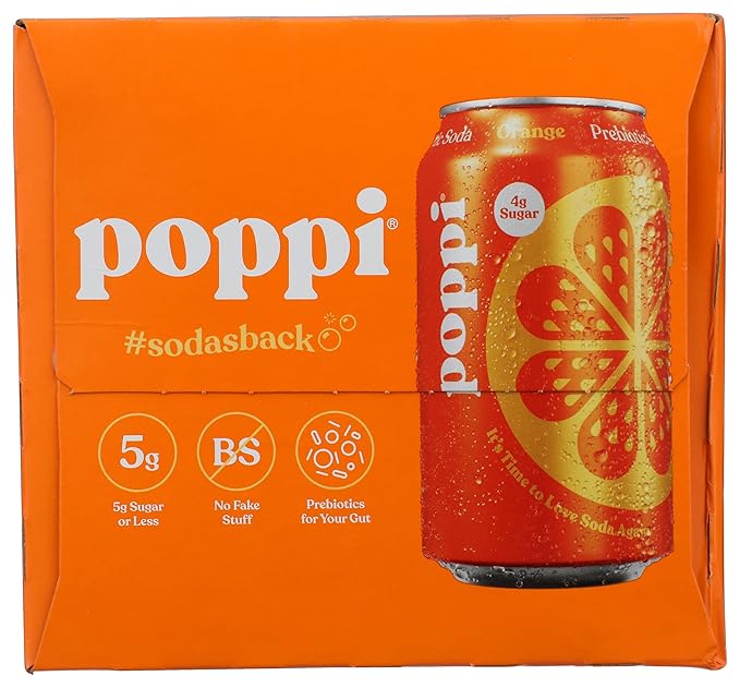 Poppi Orange is a prebiotic soda combining classic orange flavour with functional ingredients for digestive wellness. Each 12oz can contains 3g of prebiotic fibre from cassava root and organic agave inulin, plus organic apple cider vinegar.