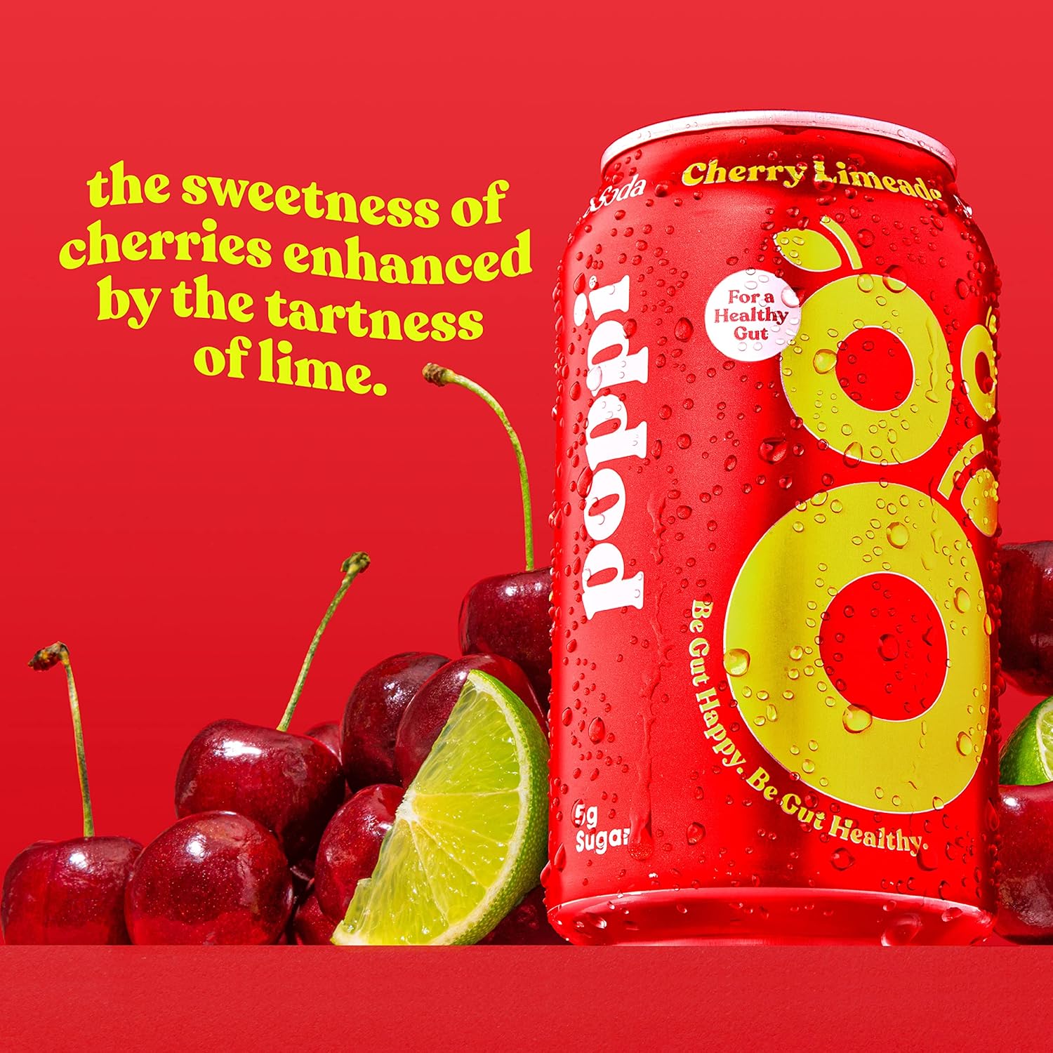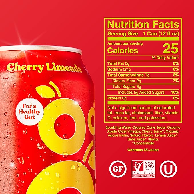 poppi Cherry Limeade is a modern prebiotic soda that combines the sweet burst of cherry with crisp lime flavor in a lightly sweetened, sparkling beverage. Each 12 fl oz can contains only 5g of sugar and 25-35 calories, making it a refreshing alternative to traditional sodas. The formula includes organic apple cider vinegar, real fruit juice from cherry, lemon, and lime concentrates, and is sweetened with a combination of organic cane sugar and stevia leaf extract.