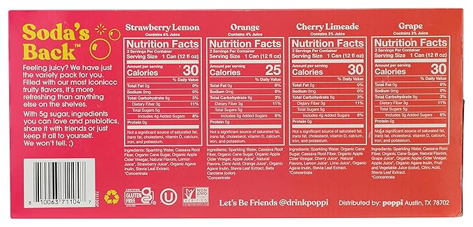 poppi Prebiotic Soda Variety Pack combines the refreshing taste of traditional soda with prebiotic fiber and apple cider vinegar to create a modern beverage alternative. Each 12 fl oz can contains only 5 grams of sugar and 25-35 calories, made with sparkling water, organic cane sugar, real fruit juice, and natural flavors sweetened with stevia.