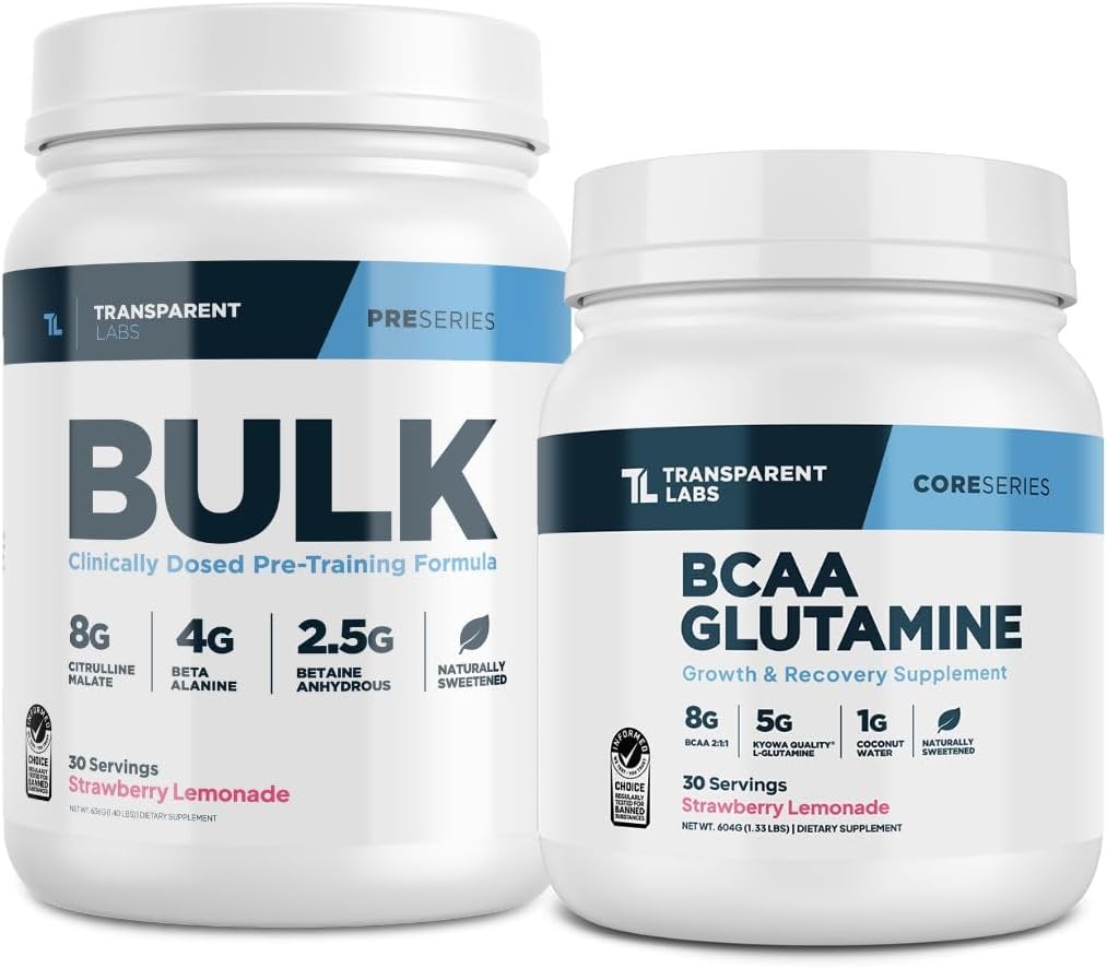 Transparent Labs Bulk Pre-Workout & BCAA Glutamine Bundle combines two complementary supplements in Strawberry Lemonade flavor. This powder-based bundle provides pre-workout energy support alongside amino acid supplementation for training sessions.