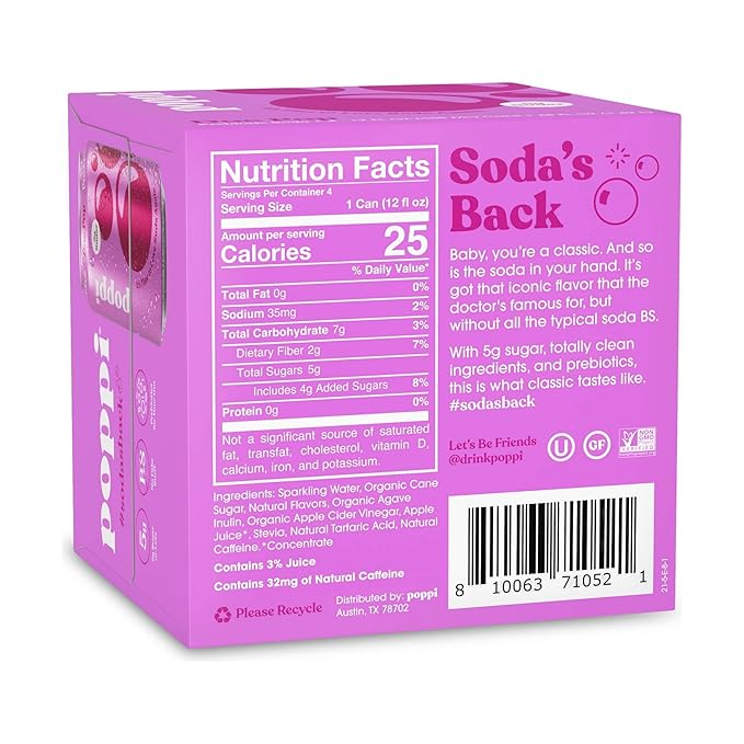poppi Doc Pop is a sparkling prebiotic soda that brings nostalgic cherry cola flavor to the functional beverage category. Each 12 fl oz can contains apple cider vinegar, prebiotics from agave inulin and cassava root fiber, real fruit juice, and organic cane sugar, delivering bold soda flavor with only 5g of sugar and 25 calories per serving. This 4-pack includes 40mg of natural caffeine per can for a gentle pick-me-up throughout the day.