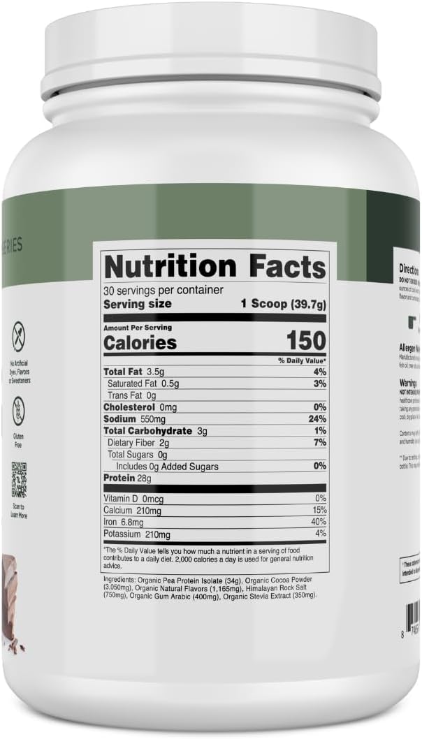 Provides 28g of complete plant-based protein per serving, Contains USDA organic pea protein isolate for muscle recovery, Includes natural cocoa powder for chocolate flavor, Supports daily protein requirements for vegans and vegetarians, Easy to digest pea protein with no added sugars or artificial ingredients