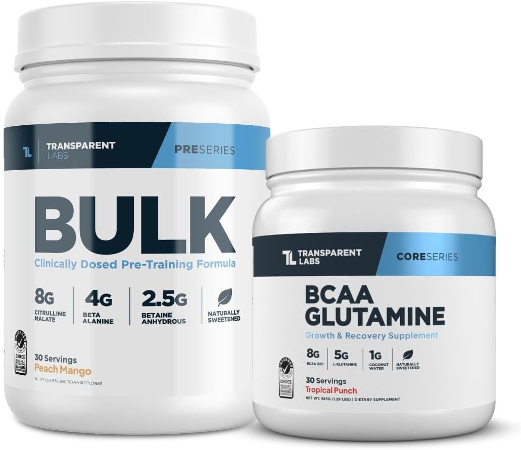 Transparent Labs Bulk Pre-Workout & BCAA Glutamine Stack is a comprehensive training bundle featuring two complementary supplements. The Peach Mango pre-workout contains citrulline and beta-alanine, while the Tropical Punch BCAA formula provides branched-chain amino acids and glutamine.