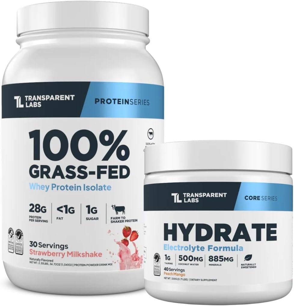 Transparent Labs Grass-Fed Whey Protein Isolate (30 Servings, Strawberry Milkshake) & Hydrate Electrolytes Powder (40 Servings, Peach Mango)