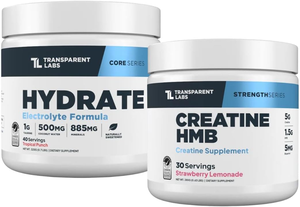 Transparent Labs Hydrate Electrolytes Powder (40 Servings, Tropical Punch) & Creatine HMB (30 Servings, Strawberry Lemonade)